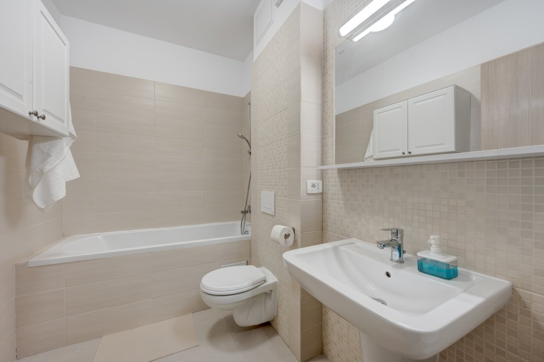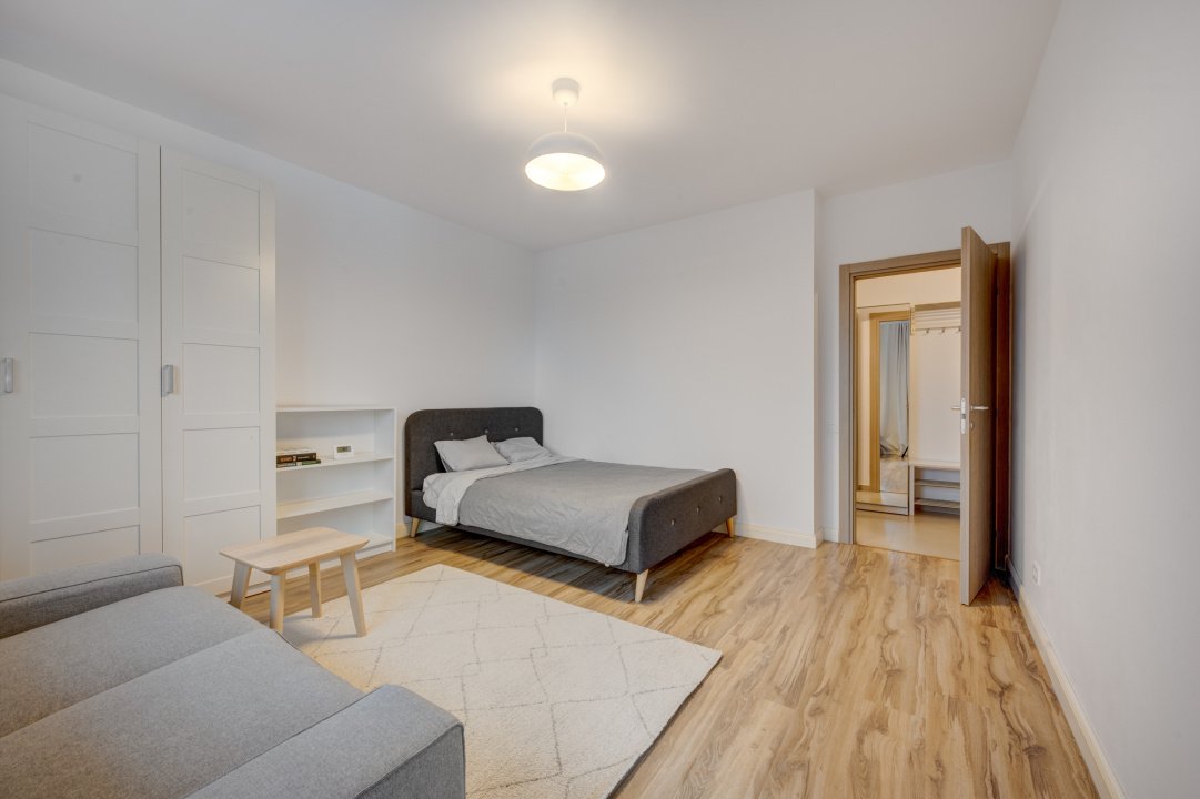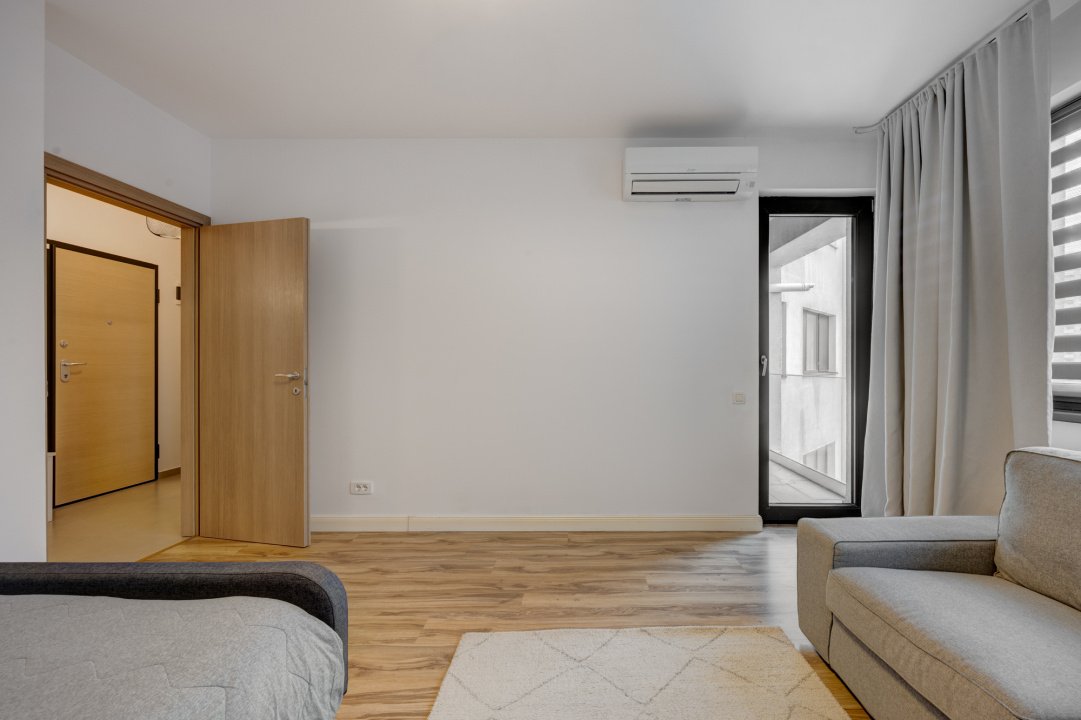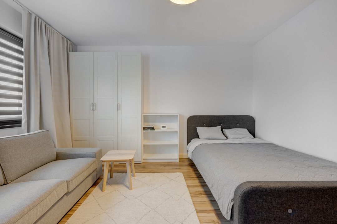 Livingul este generos si amenajat atat cu pat cat si cu canapea, dulap pentru haine, etajera si o masuta de cafea. Spatiul permite si amplasarea unui birou. In cazul in care este nevoie, proprietarul poate achizitiona un TV.
