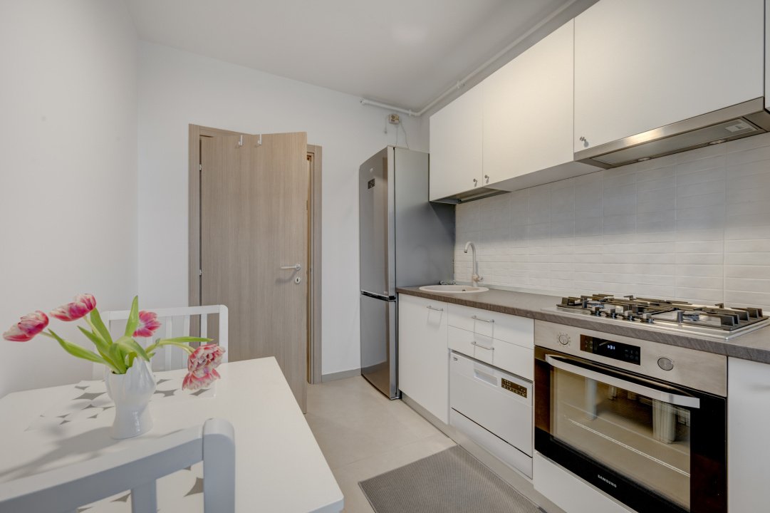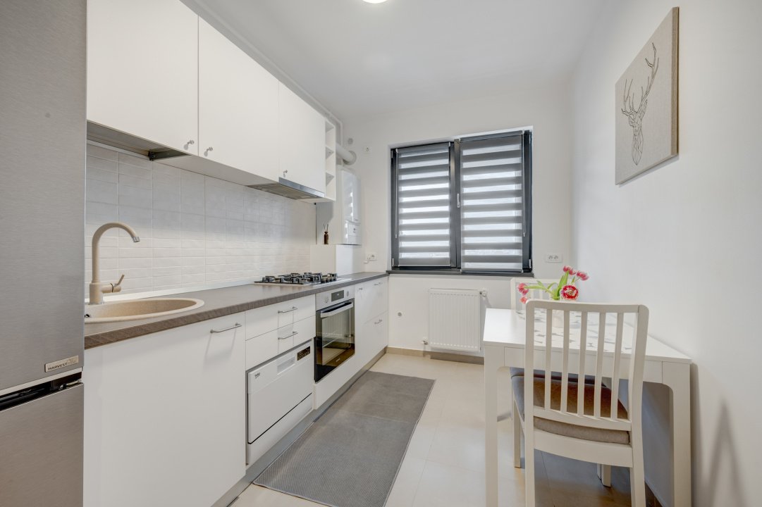 Bucataria este mobilata si utilata complet, echipata cu masina de spalat vase ( versiune mica), plita, cuptor, hota, frigider. Tot in bucatarie este amenajat un loc pentru servit masa.