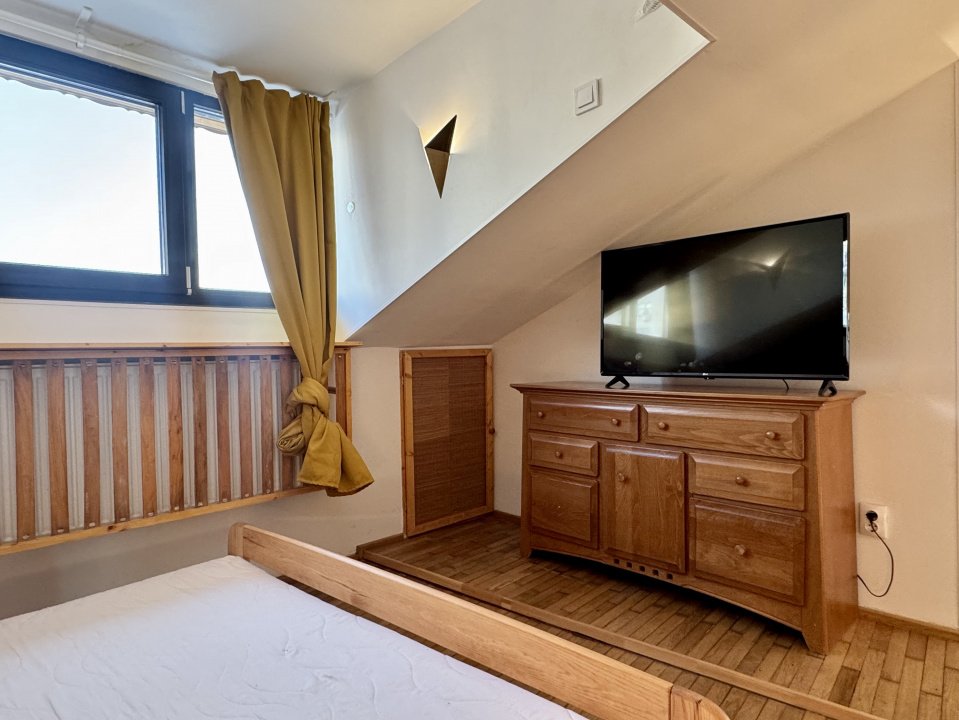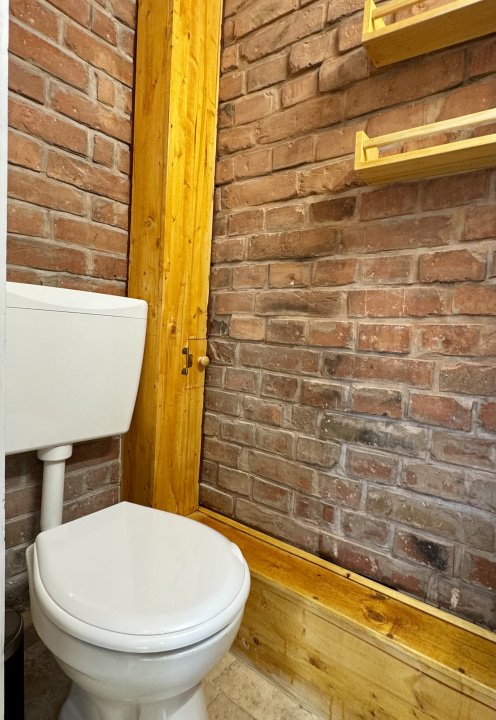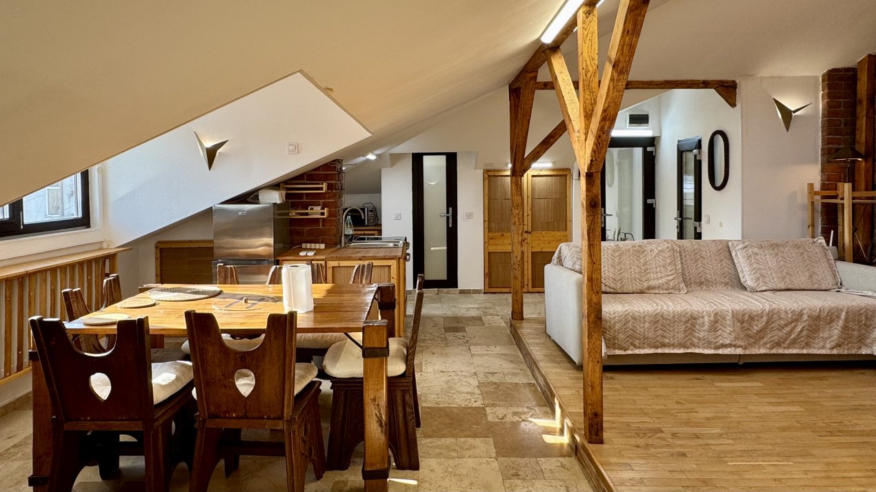 Locuința este dotată cu centrală termică proprie, două aparate de aer condiționat, bucătărie complet mobilată și utilată, iar baia beneficiază de fereastră pentru ventilație naturală. Mobilarea este realizată predominant din lemn, cu grinzi aparente și accente de cărămidă, oferind un aer cald și primitor, cu o atmosferă de loft cu influențe montane.