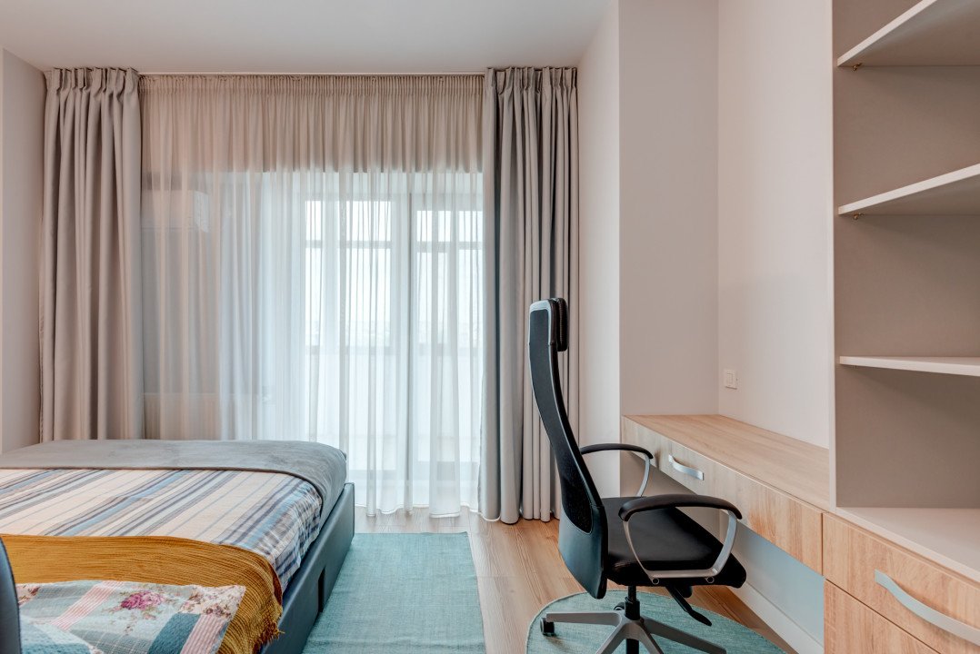 Camera, in suprafata de aproximativ 30 mp, a fost impartita in doua zone separate printr-o biblioteca/ etajera moderna. Zona de zi este amenajata cu o canapea extensibila, 2 masute de cafea, comoda si TV. Zona de dormit este amenajata cu pat matrimonial, dulap de haine si un birou cu scaun.