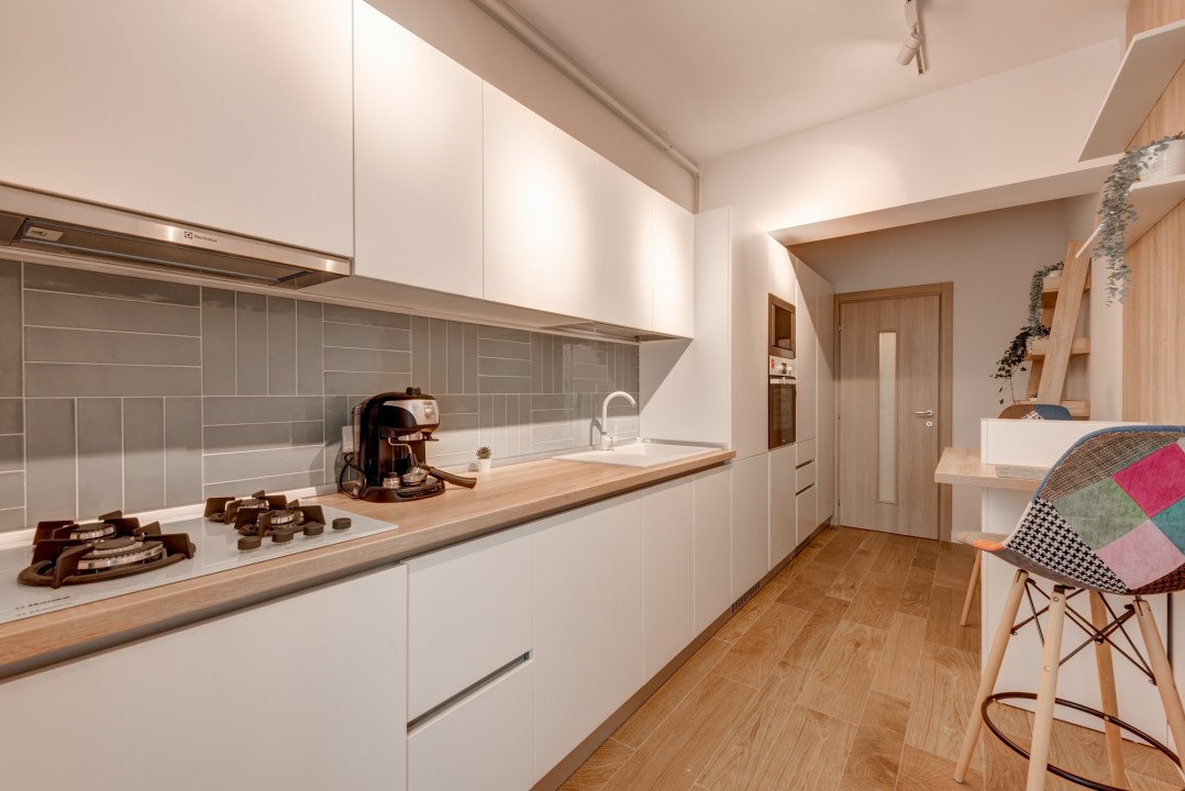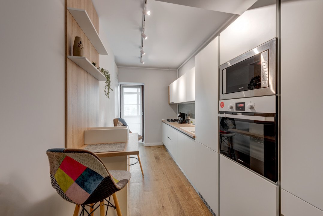 Bucatariaa are o zona de luat masa pentru 2 persoane.