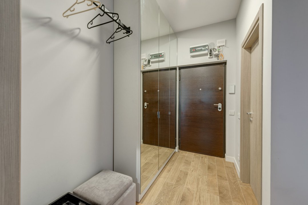 Holul de la intrare este amenjat cu un dulap generos special gandit pentru incaltaminte dar si cu o bara pentru haine. Baia este amenajata cu un dus tip walk-in, obiecte sanitare moderne si lavoar cu dulap generos.
