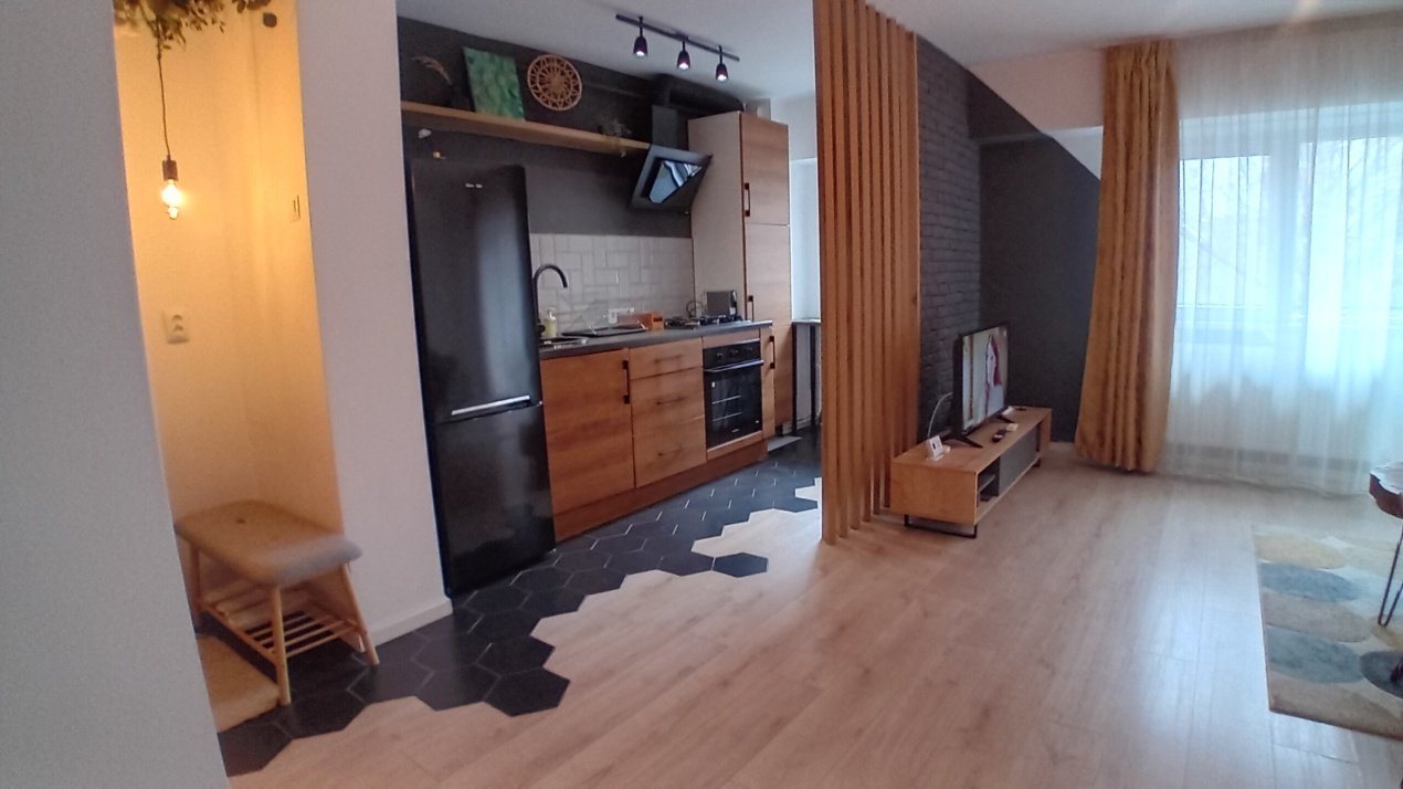 Studioul este mobilat modern cu pat, canapea, masuta de cafea, fotoliu, comoda TV si TV, bucatarie echipata cu plita, cuptor si hota, combina frigorifica, masina de spalat, aspirator, prajitor paine, cafetiera, vesela si alte ustensile de bucatarie, aer conditionat, uscator de par.