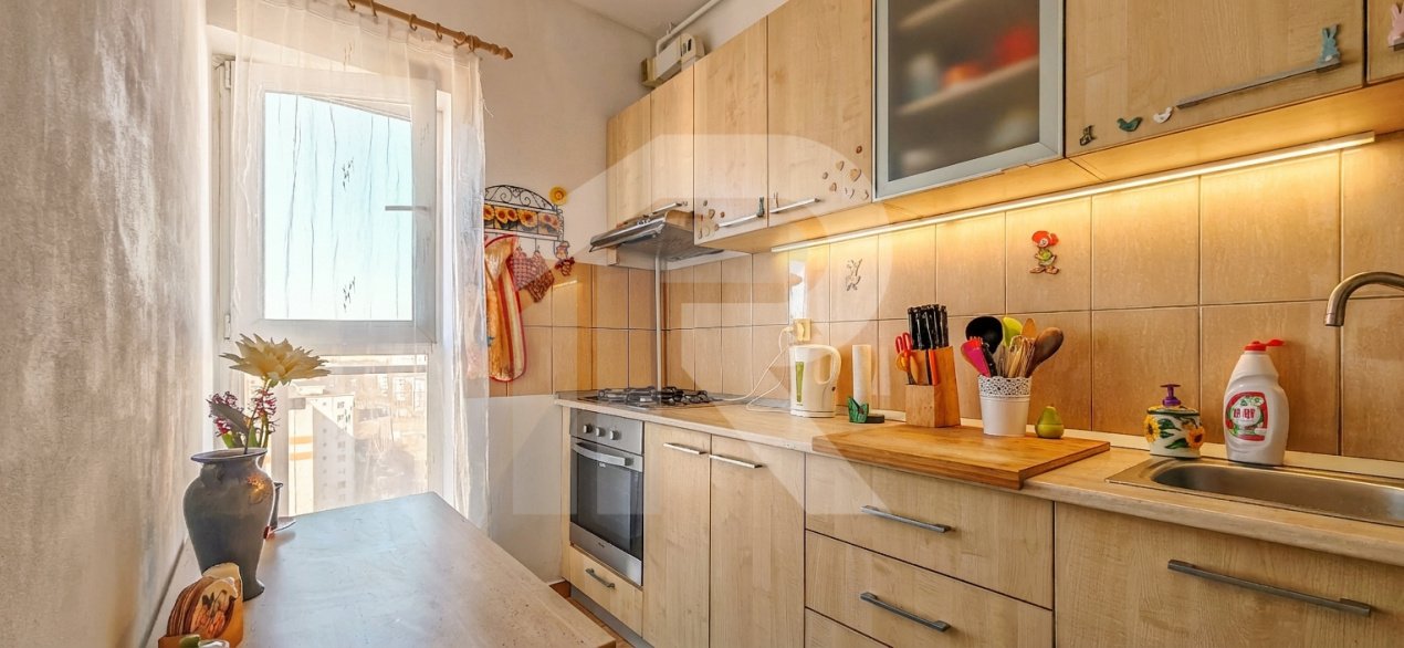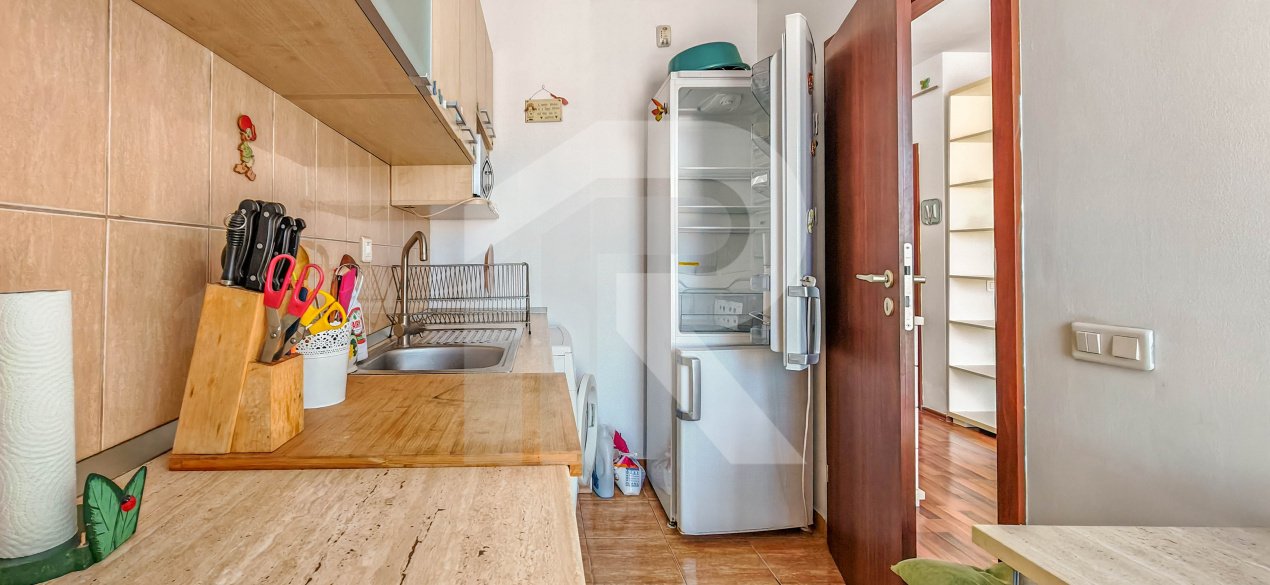• Bucătărie separată, complet utilată (aragaz, hotă, frigider)