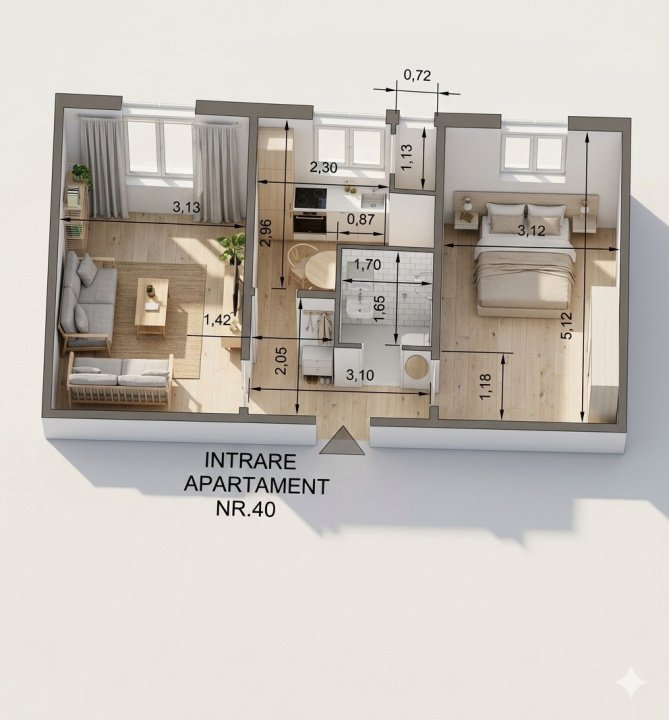 Locuința oferă un spațiu modern, eficient compartimentat, ideal pentru un cuplu sau pentru profesioniști care lucrează în zona de nord a Bucureștiului.