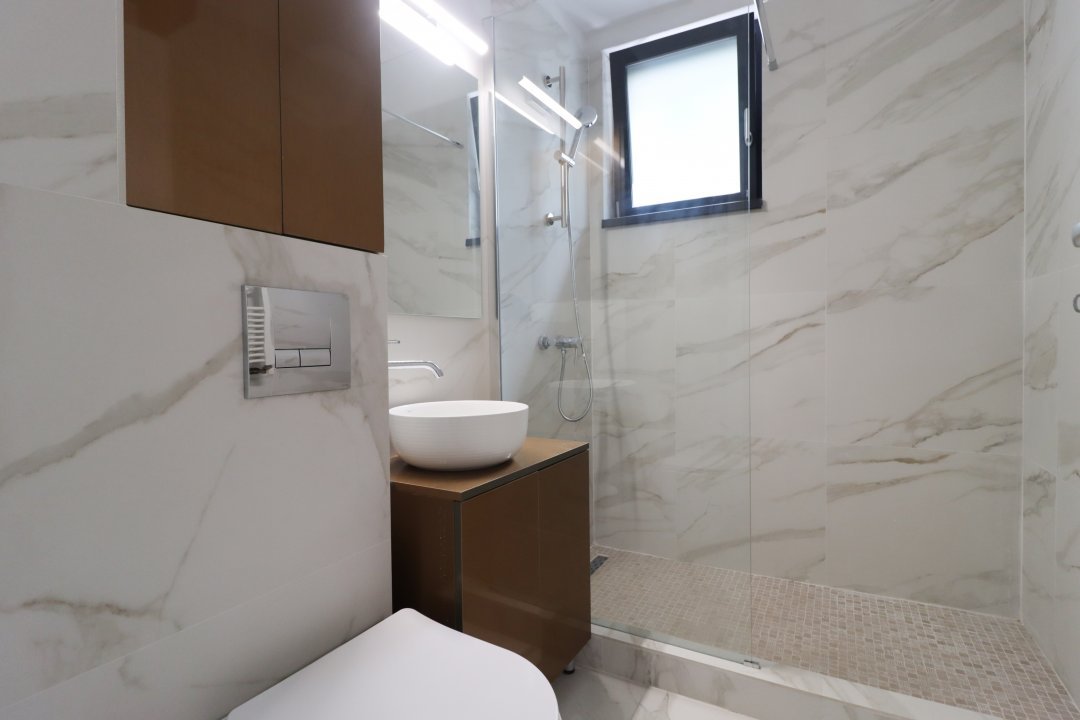 Design modern, cabină de duș, chiuvetă cu mobilier integrat și oglindă mare.