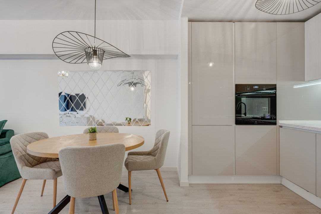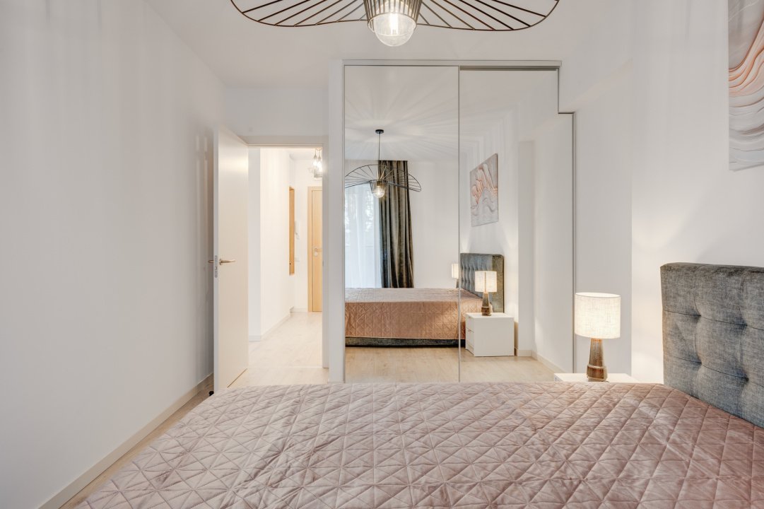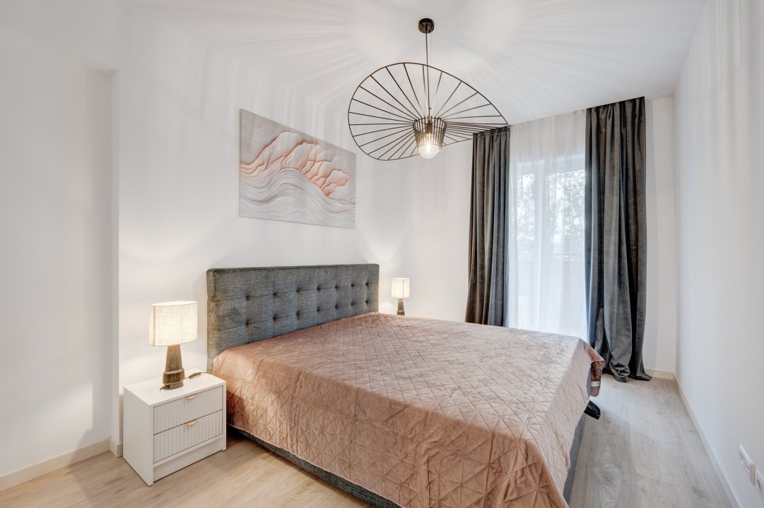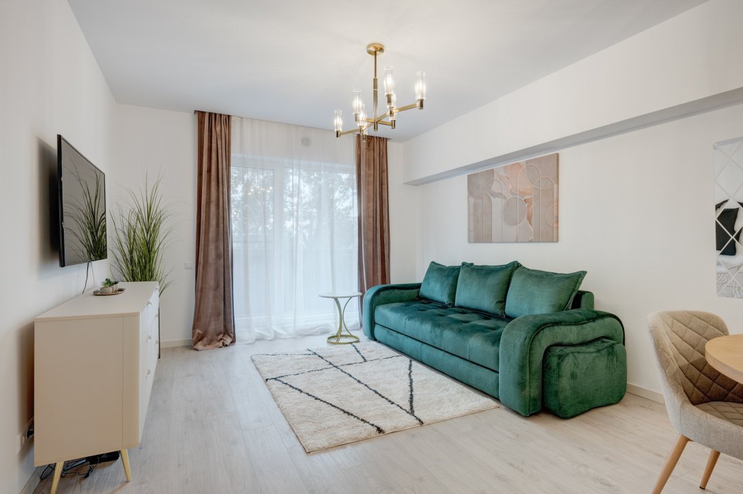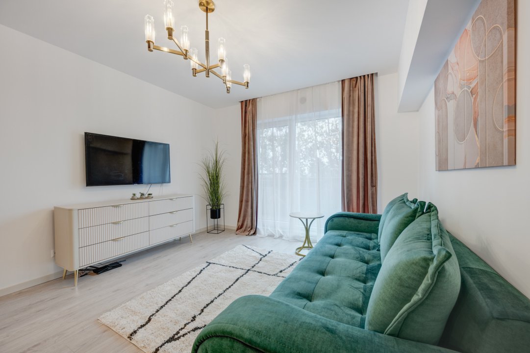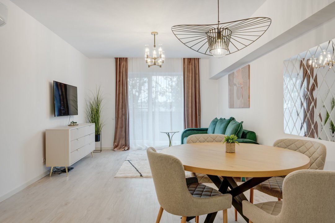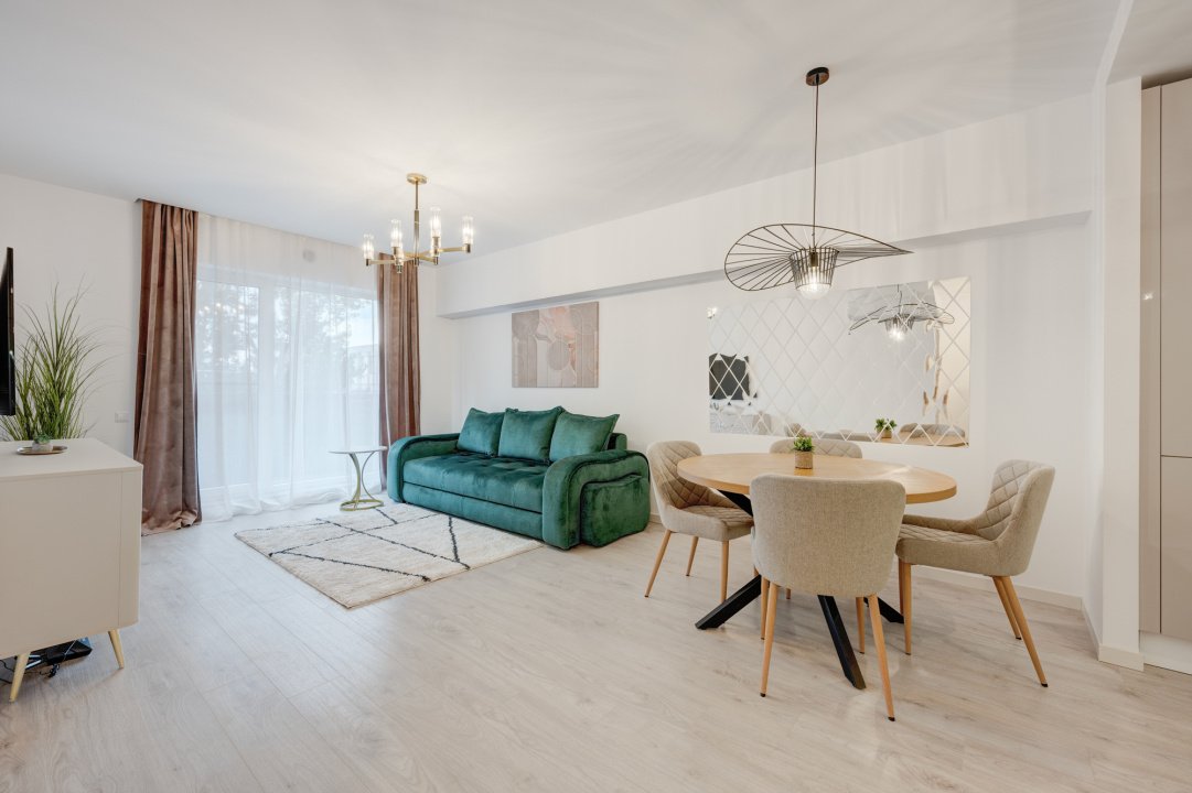 Livingul este amenajat modern cu o canapea extensibila, loc de dining pentru 4 persoane si o comoda Mobexpert cu Smart TV nou. Dormitorul este complet mobilat cu dressing generos, pat matrimonial cu saltea si doua noptiere.