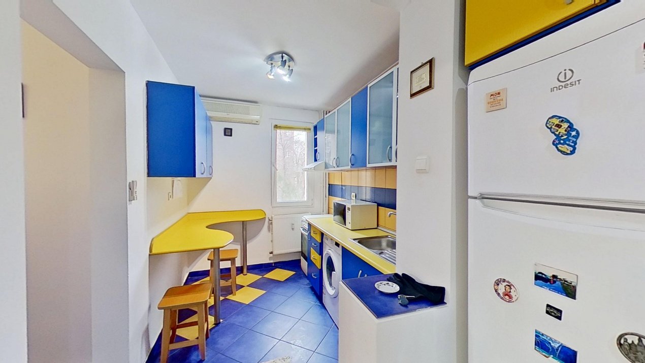 ✓ Design memorabil cu accente de culoare albastru-galben aplicate armonios (pardoseală, mobilier, detalii)