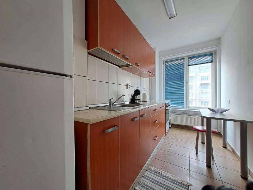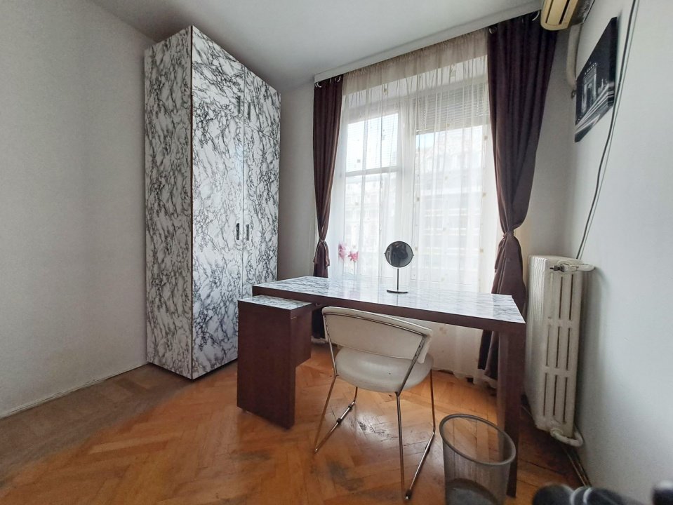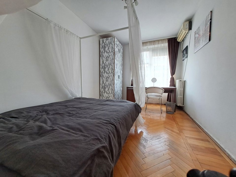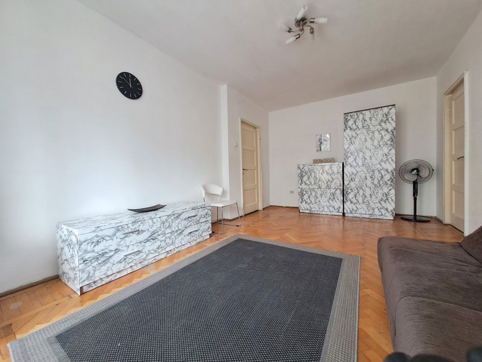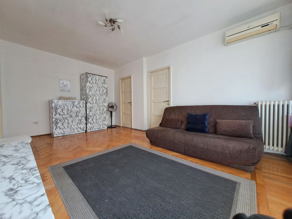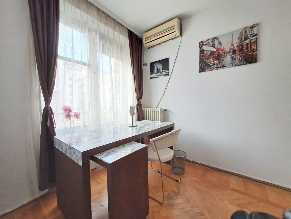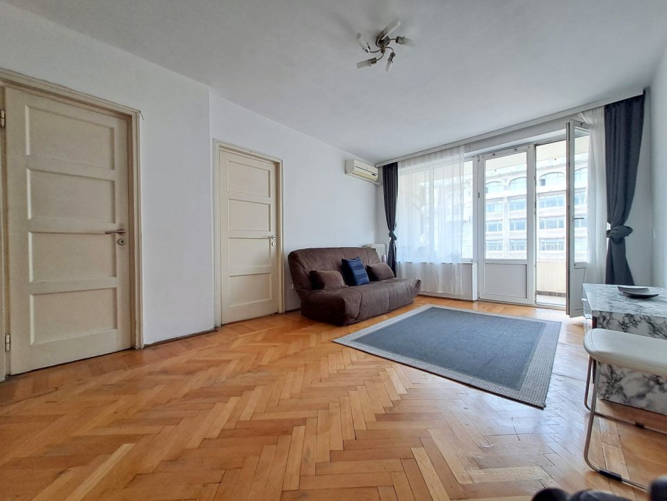 Apartamentul se afla pe bulevardul Magheru - Piata Romana, este situat la etaj inferior, semidecomandat, se compune din hol intrare, bucatarie, camera de zi, hol intermediar, dormitor, baie, spatii depozitare si un balcon amplu orientat catre bulevard.