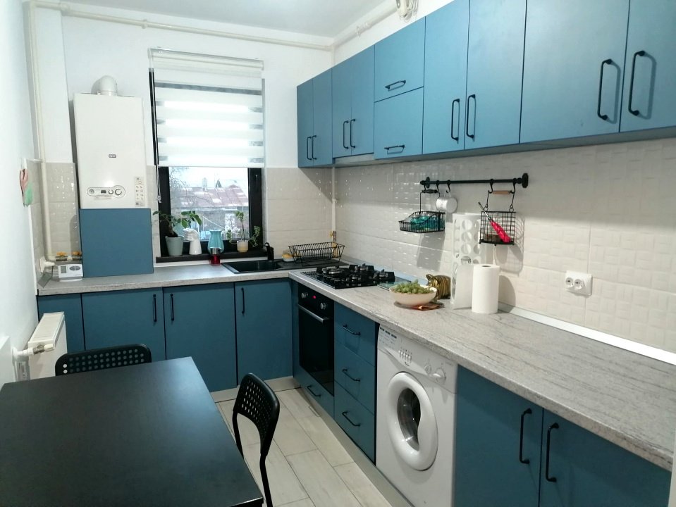 Bucataria este moderna, fiind dotata cu plita pe gaz, cuptor electric, masina de spalat haine, masina de spalat vase, hota si combina frigorifica.