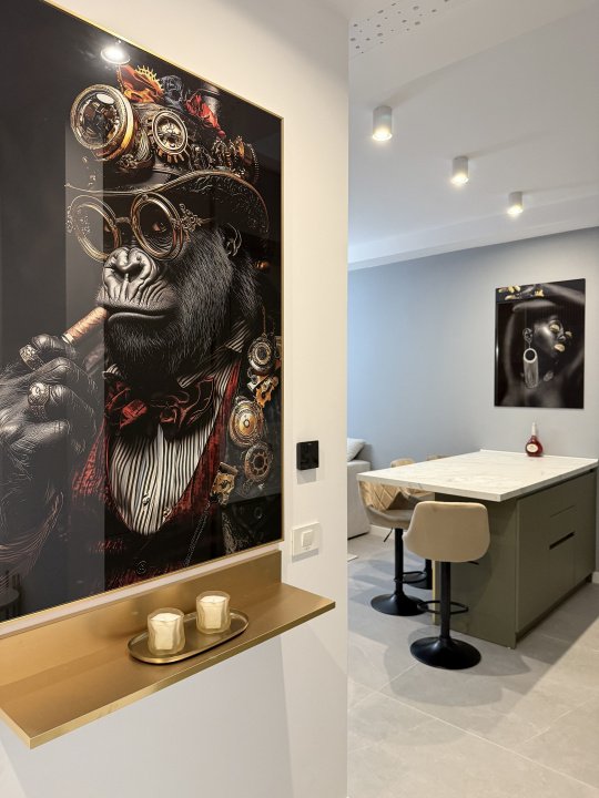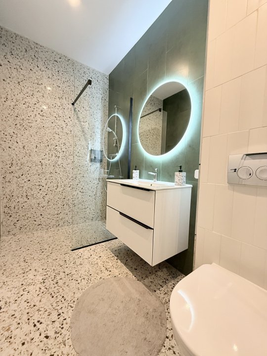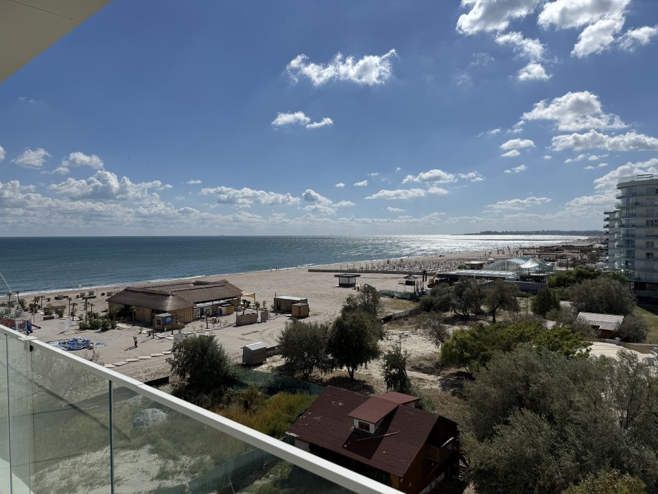 Apartamentul dispune de două terase generoase, cu vedere superbă atât către mare, cât și către lac, oferind un cadru ideal pentru relaxare. În plus, sunt incluse două locuri de parcare proprii.