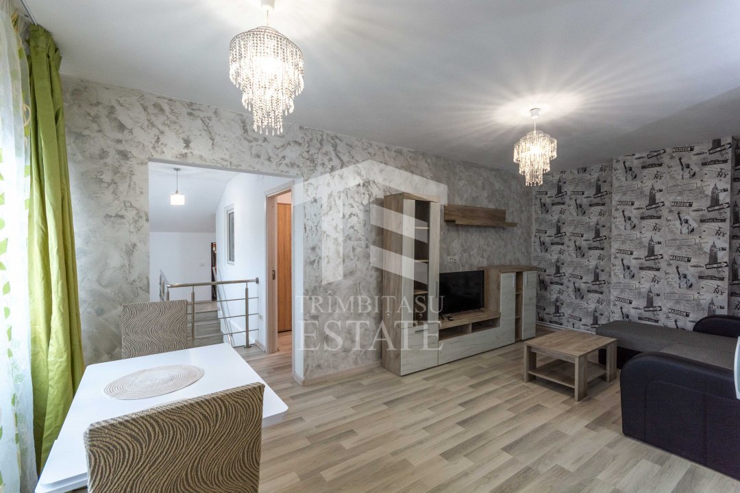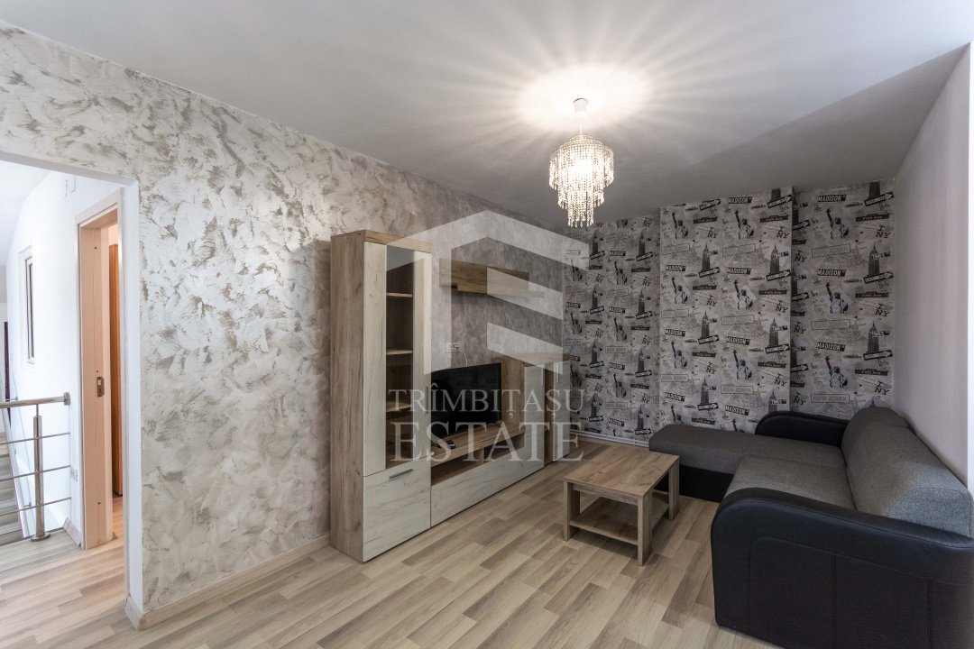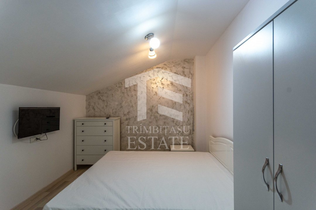 Apartamentul se afla la mansarda unei vile(singur pe etaj), constructie 2007, in suprafata totala de aproximativ 130 mp, foarte bine impartit intr-o zona de relaxare si doua zone de dormit, ce dispune de toate amenajarile de care ar avea nevoie un potential chirias (maina de spalat rufe, uscator rufe, frigider, aragaz, aparat aer conditionat, incalzire centrala termica, 2 TV).