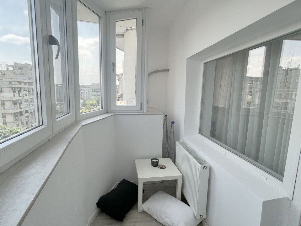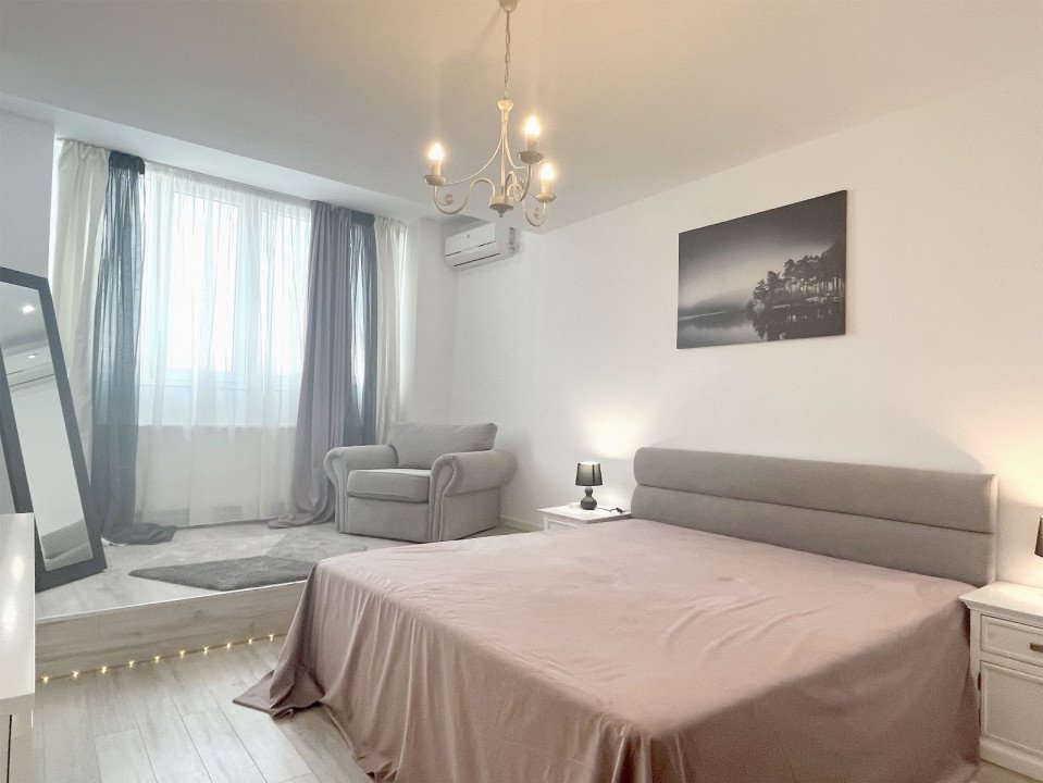 Apartament 3 camere total renovat, cu centrala termica proprie, Bucataria complet echipata, inclusiv masina de spalat vase, spatiul de luat masa, A/C, canapea si TV 180 cm.Are 2 dormitoare, 1 Dormitor:pat, spatii de depozitare, birou, fereastra franceza orientata spre Est, A/C, balcon;2 Dormitor: pat, spatii de depozitare, TV, A/C, fereastra spre balcon, orientare Vest.Sunt 2 bai, Baia mare cu cada si fereastra, Baie de serviciu cu dus.Apartamentul se afla la etajul 9/9, Piata Alba Iulia-Decebal, bloc cu 2 intrari si este supravegheat video 24/24.