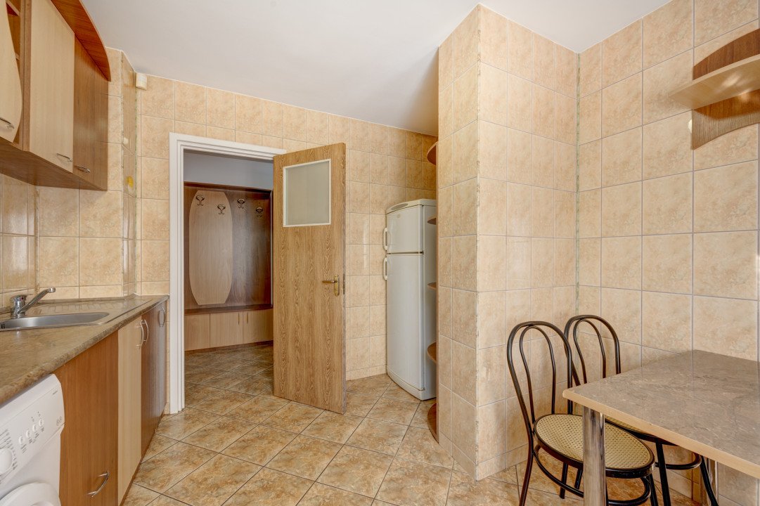 Bucataria este mobilata si dotata cu aragaz, hota, frigider, masina de spalat rufe si cuptor cu microunde. Tot in bucatarie este si locul de luat masa pentru 4 persoane. Bucataria este extrem de spatioasa.