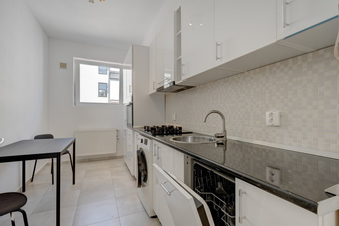 Bucataria este mobilata si echipata cu electrocasnicele necesare: plita, cuptor, hota, frigider, masina de spalat vase si masina de spalat rufe.