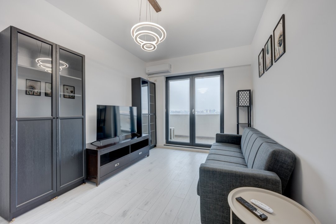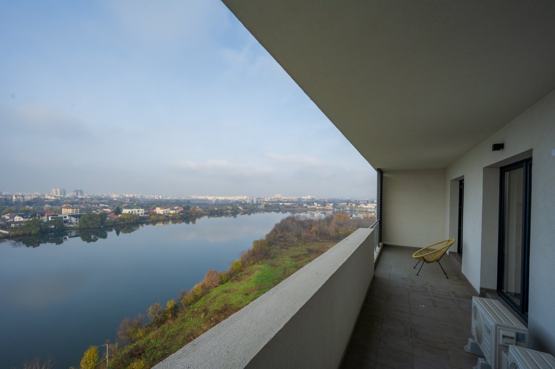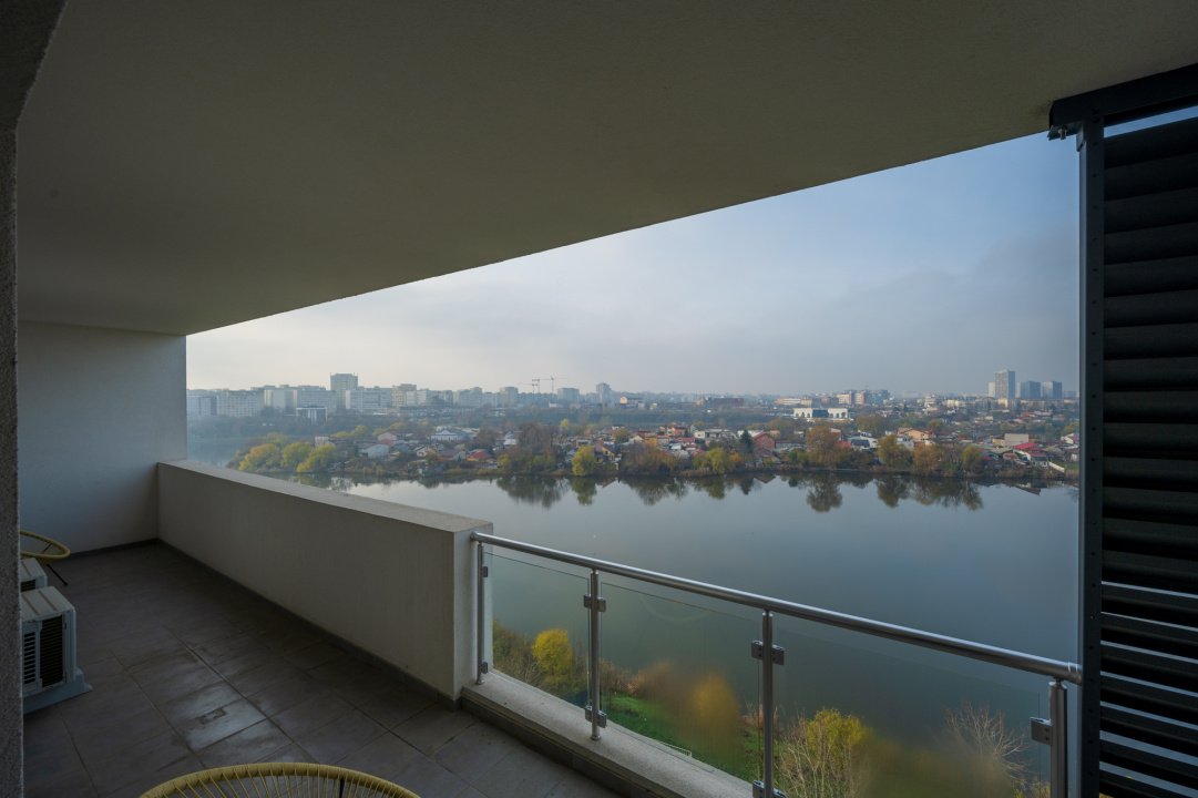 Interior luminos, mobilat si utilat complet, bine compartimentat, cu ferestre panoramice de la podea la tavan, dormitor matrimonial, 2 bai si acces din toate camerele catre terasa de 16 mp cu vedere spre lac.