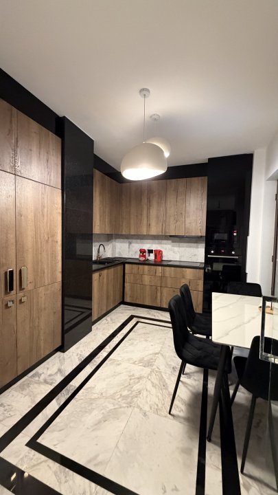 Bucătăria este închisă, ideală pentru gătit, complet echipată cu electrocasnice moderne și multiple spații de depozitare. Designul este pus în valoare de fronturi din lemn natural, accente negre lucioase și pardoseală din marmură. Din bucătărie se face acces către terasa apartamentului, care poate fi amenajată cu mobilier exterior.