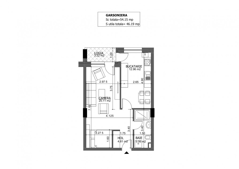 Detalii apartament: 1 bai, suprafata utila total de 46,19mp din care 3,22mp balconul.
