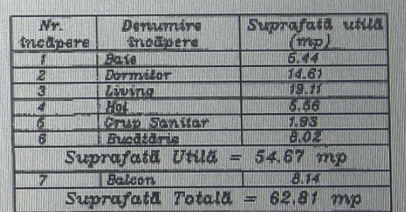 Bucataria inchisa mobilată si utilată, living, dormitor cu baie proprie cu fereastra, si un grup sanitar.