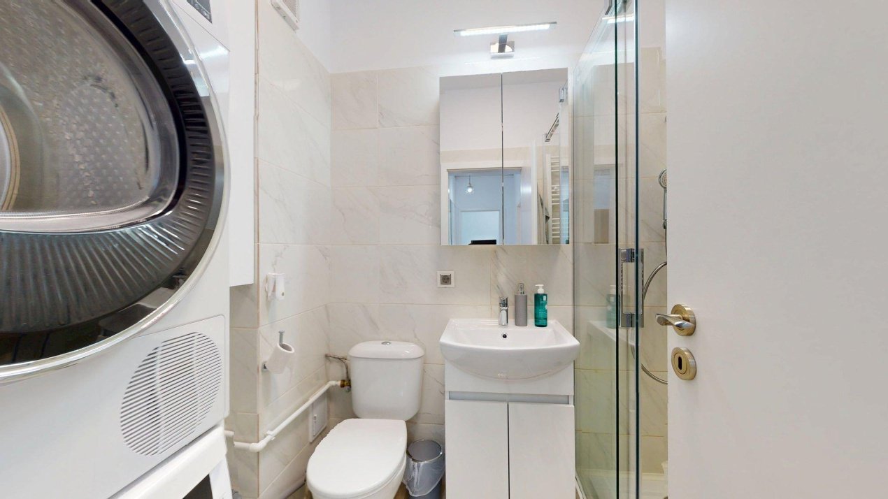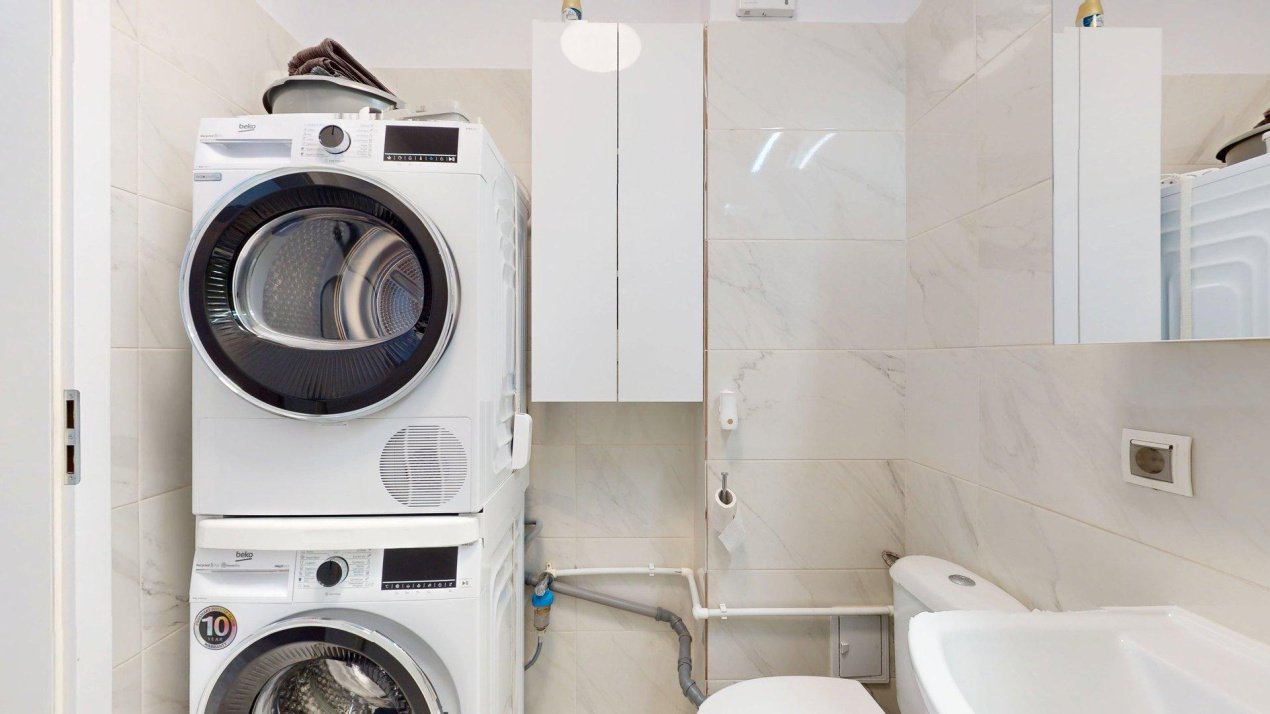 Sistem de Spălare/Uscare: Mașină de spălat rufe și uscător separat de la Beko, integrate discret pentru a menține estetica locuinței.