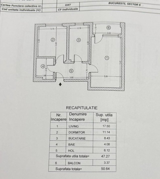 Suprafață Utilă Totală: 47.27 mp (50.64 mp suprafață totală).