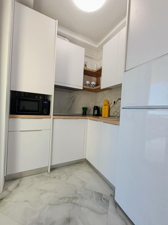 Agenția Experți Imobiliari vă oferă spre achiziție un apartament cu 2 camere, situat la etajul 5 din 6, într-un bloc nou, dat în folosință în anul 2024, dotat cu lift. Apartamentul este orientat frontal către mare și se vinde exact ca în fotografii, complet mobilat și utilat modern, cu electrocasnice noi. Suprafața utilă este de 41 mp, la care se adaugă un balcon de 8 mp. Proprietatea beneficiază de loc de parcare în interiorul complexului, interfon cu cameră video, acces în apartament prin yală smart, aer condiționat smart, senzori de fum și finisaje moderne. O locuință ideală atât pentru rezidență, cât și pentru investiție.