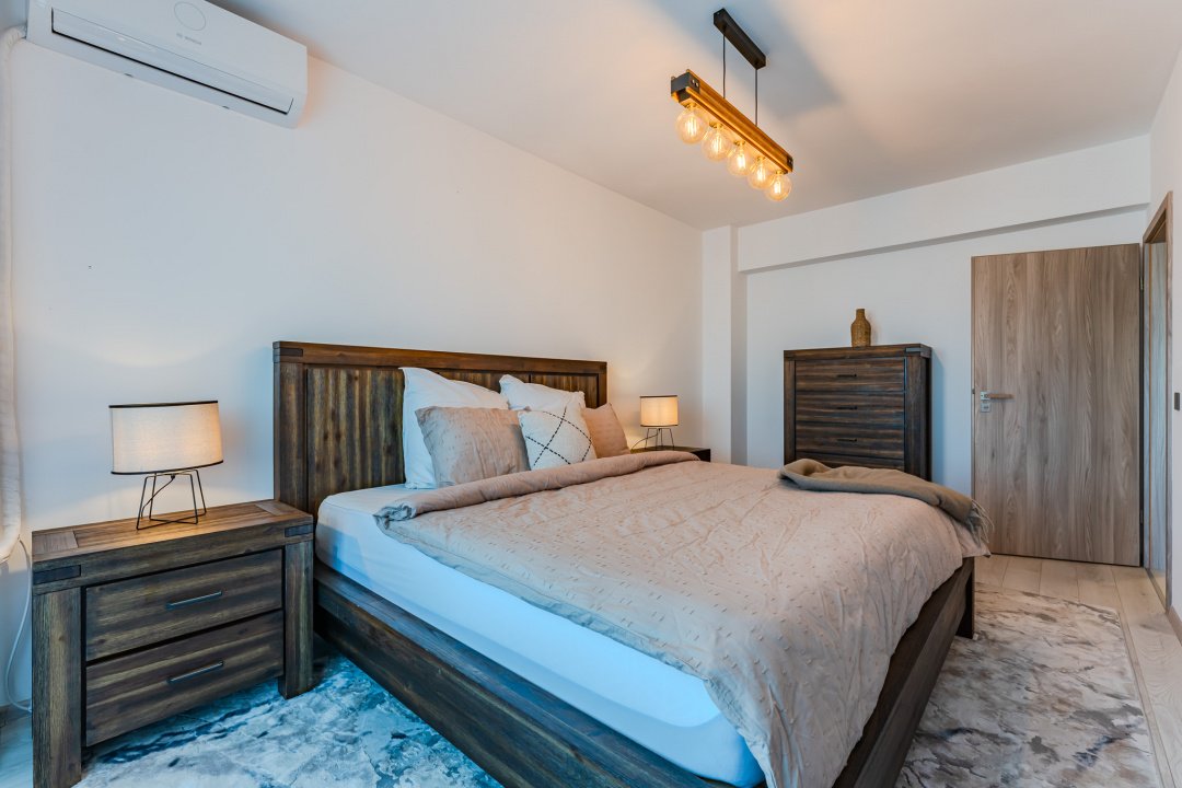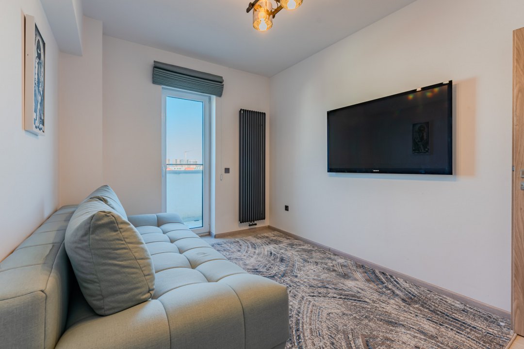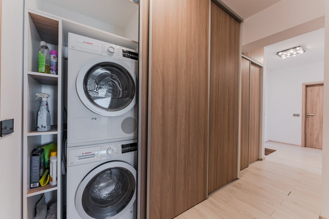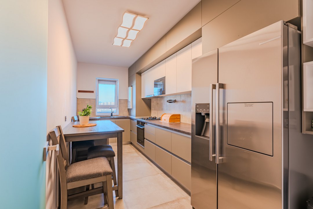 Astfel, bucataria este dotata cu: frigider side by side - cu dispenser de gheata si spatiu bauturi, cuptor cu microunde incorporat, aragaz, cuptor electric, masina de spalat vase, hota. In lfiecare camera se afla cate un smart TV, iar in living exista si un sistem audio performant.