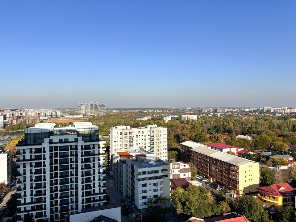 Aflat la etajul al 14-lea ai unei clădiri de 20 de etaje, acest apartament oferă o vedere panoramică impresionantă, având în prim plan zona de case, clădiri noi si Lacul Floreasca. Acest imobil are o suprafata TOTALA de 76mp, având un balcon de 8mp, doua băi, 2 dormitoare si un Living spațios împreună cu spațiul dedicat bucătăriei.