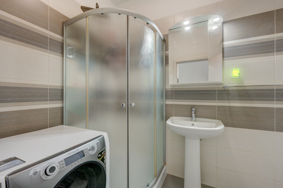 Zona dormitoarelor este deservita de un alt hol (in care s-a amenajat un dulap suplimentar) si de cele doua grupuri sanitare. Grupul sanitar principal are fereastra si este amenajat cu cada iar grupul sanitar de serviciu este amenajat cu cabina de dus si are aerisire pe coloana cu ventilator. Dormitoarele au suprafetele aproximativ egale ( 12,86mp si 12,73 mp) si beneficiaza de ferestre generoase. Tot apartamentul beneficiaza de ferestre panormaice si rulouri exterioare la toate ferestrele. Tamplaria pvc este Rehau culoare antracit.