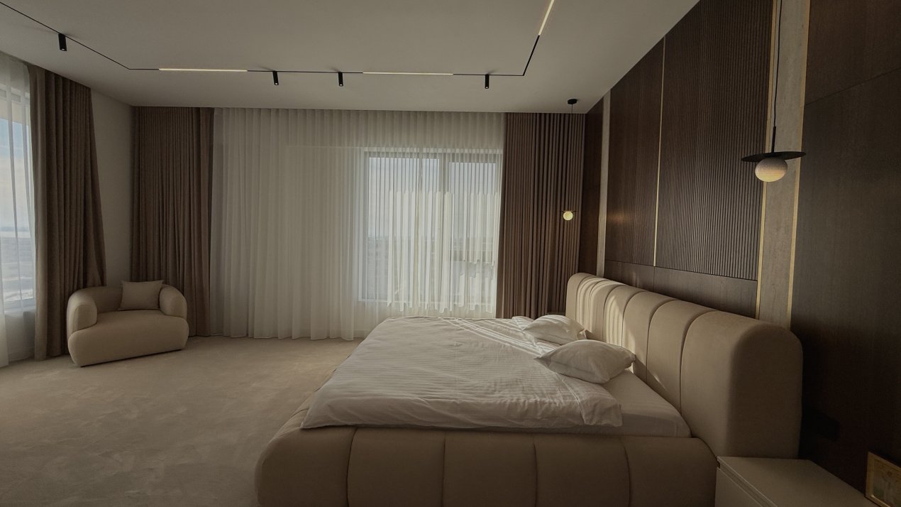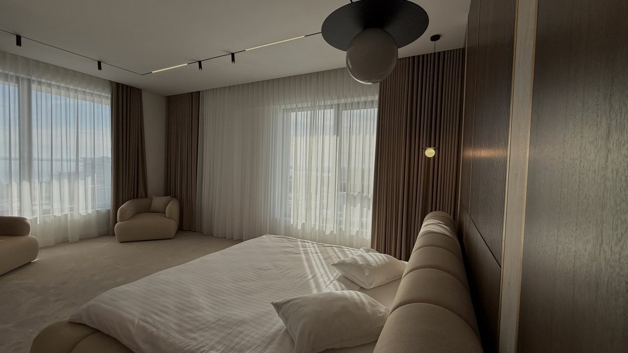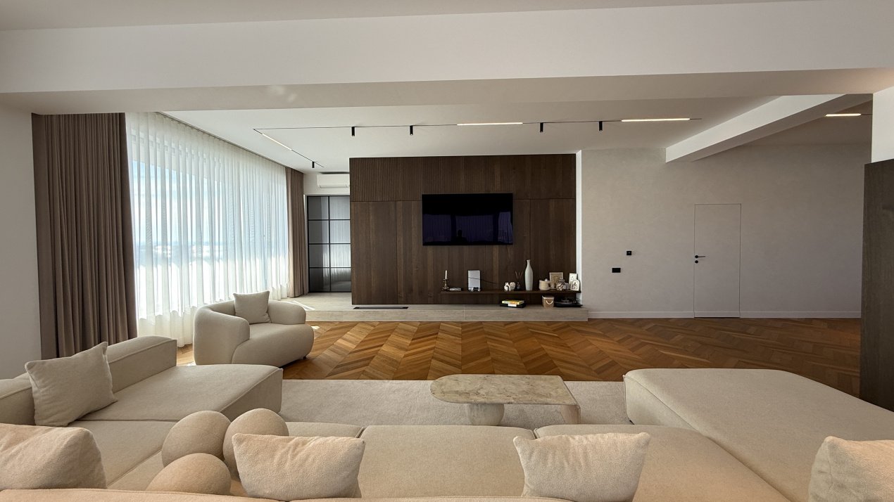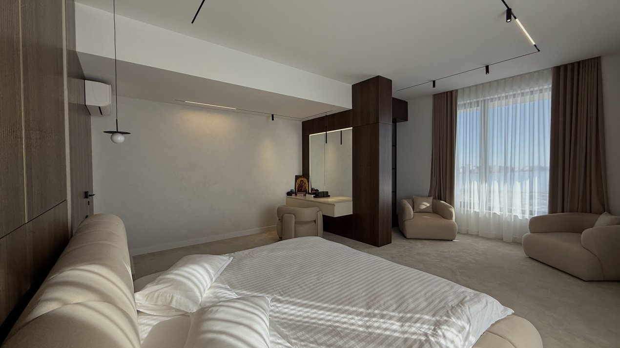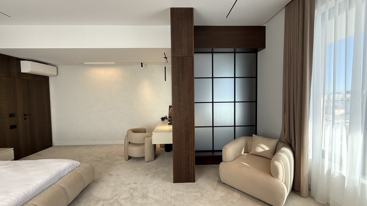 Lumina naturală inundă fiecare încăpere datorită suprafețelor vitrate generoase, iar compartimentarea deschisă creează un ambient aerisit și rafinat. Întregul apartament a fost amenajat cu atenție la fiecare detaliu, pe baza unui proiect de design interior realizat de o echipă profesionistă, unde mobilierul și elementele decorative se îmbină armonios pentru a crea o atmosferă elegantă și primitoare.