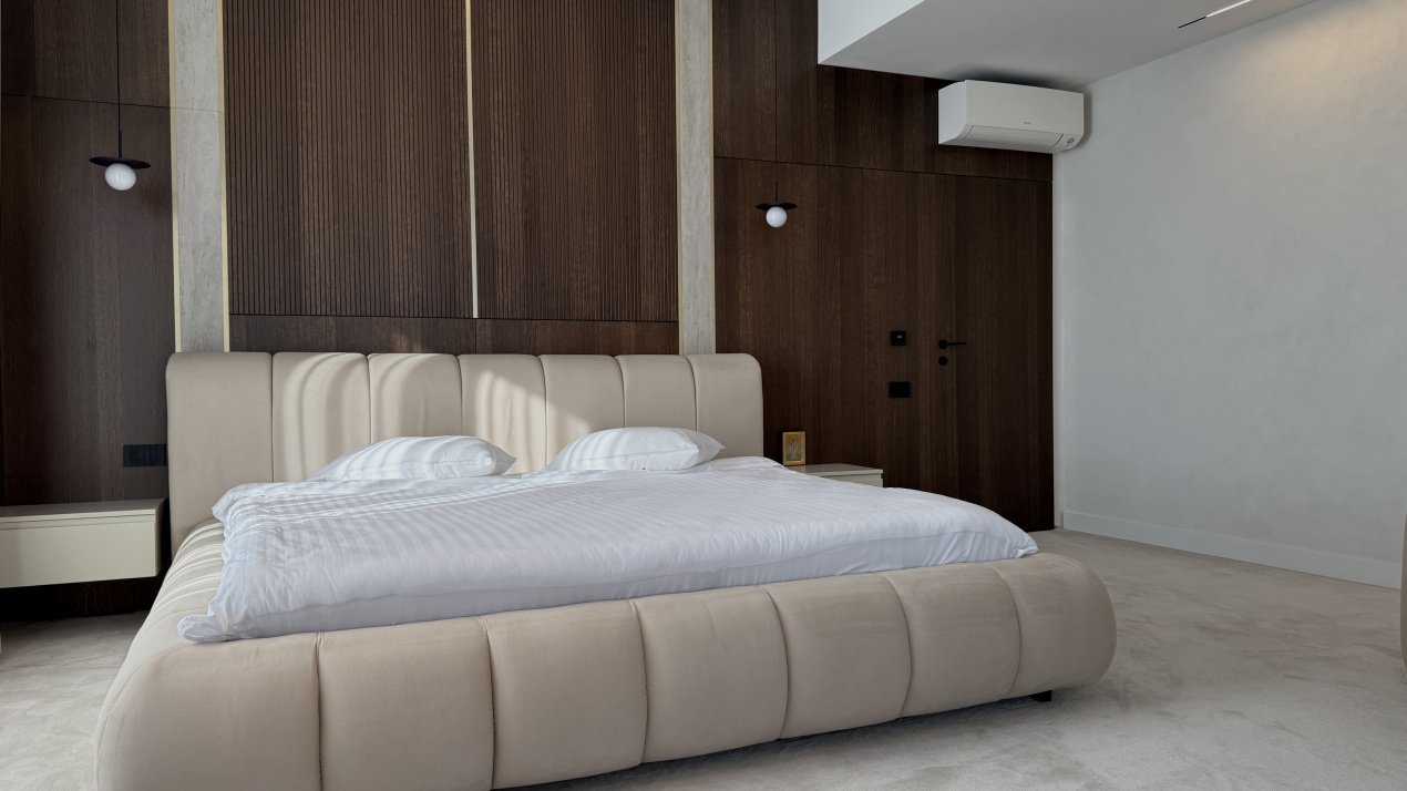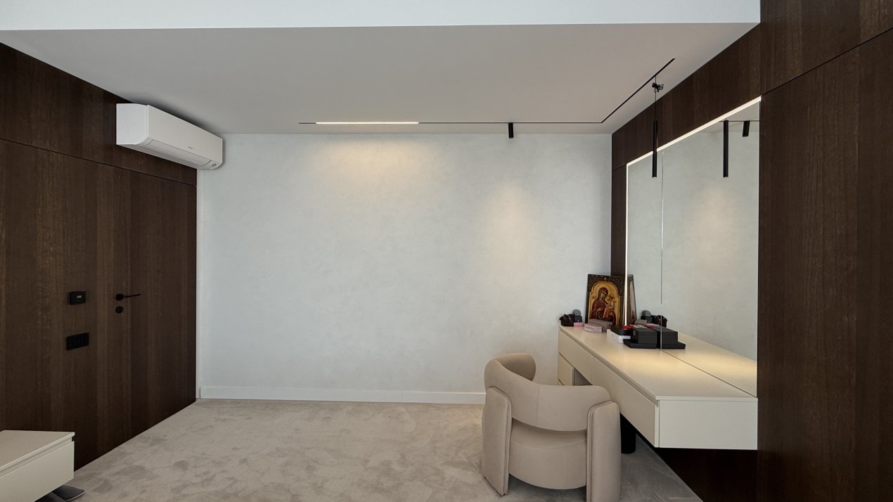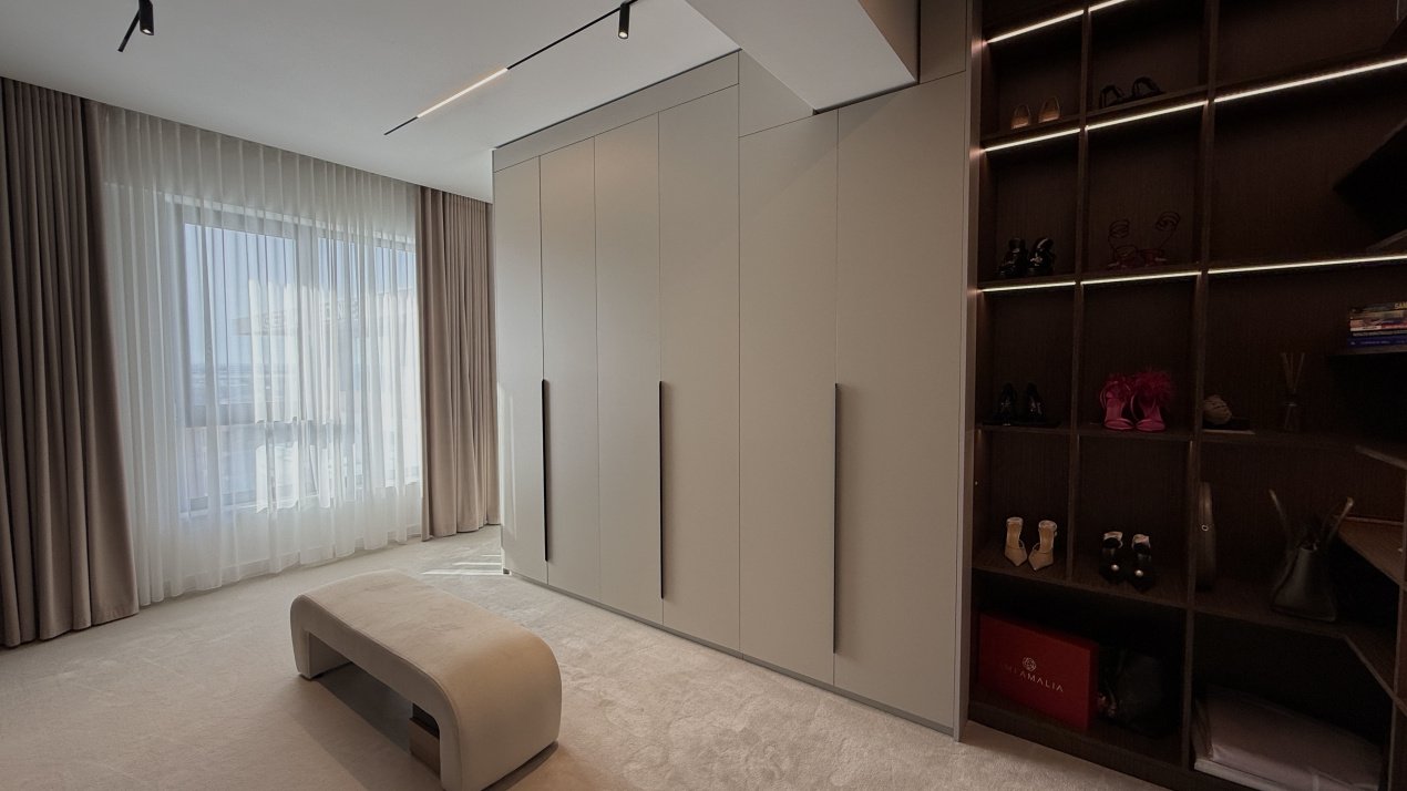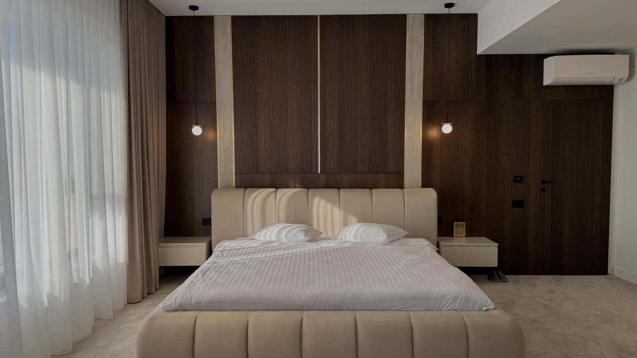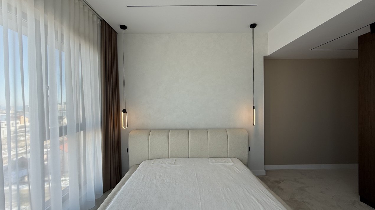 Lumina naturală inundă fiecare încăpere datorită suprafețelor vitrate generoase, iar compartimentarea deschisă creează un ambient aerisit și rafinat. Întregul apartament a fost amenajat cu atenție la fiecare detaliu, pe baza unui proiect de design interior realizat de o echipă profesionistă, unde mobilierul și elementele decorative se îmbină armonios pentru a crea o atmosferă elegantă și primitoare.