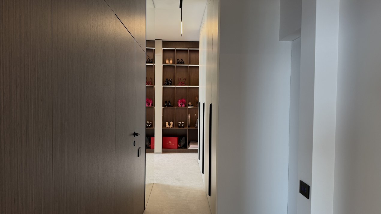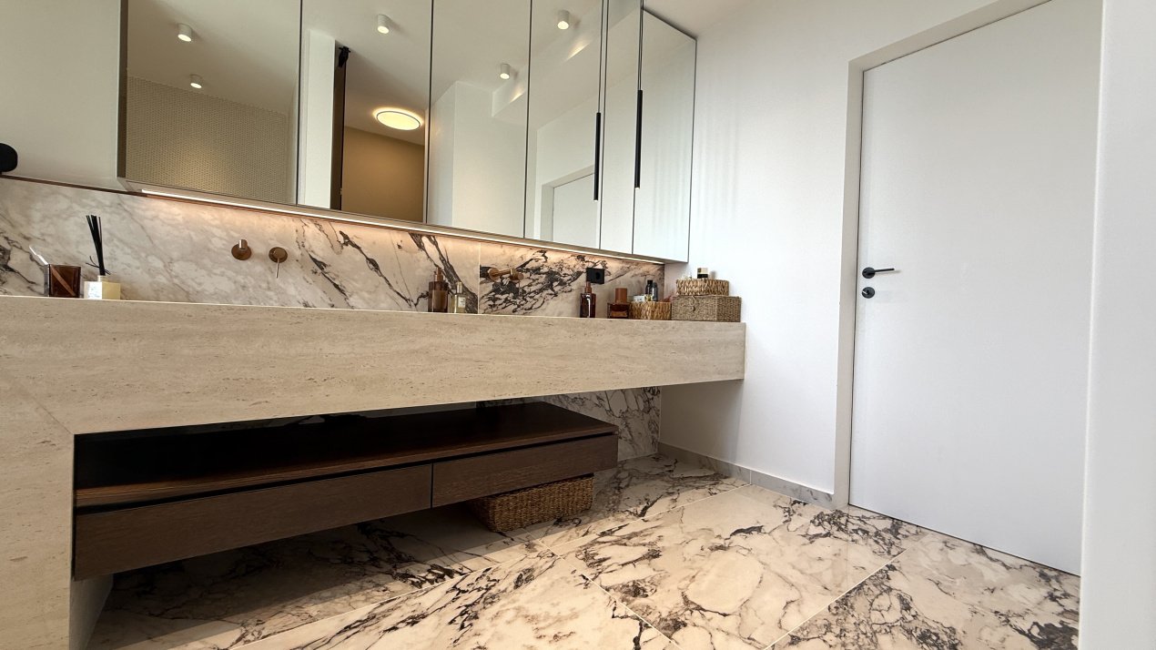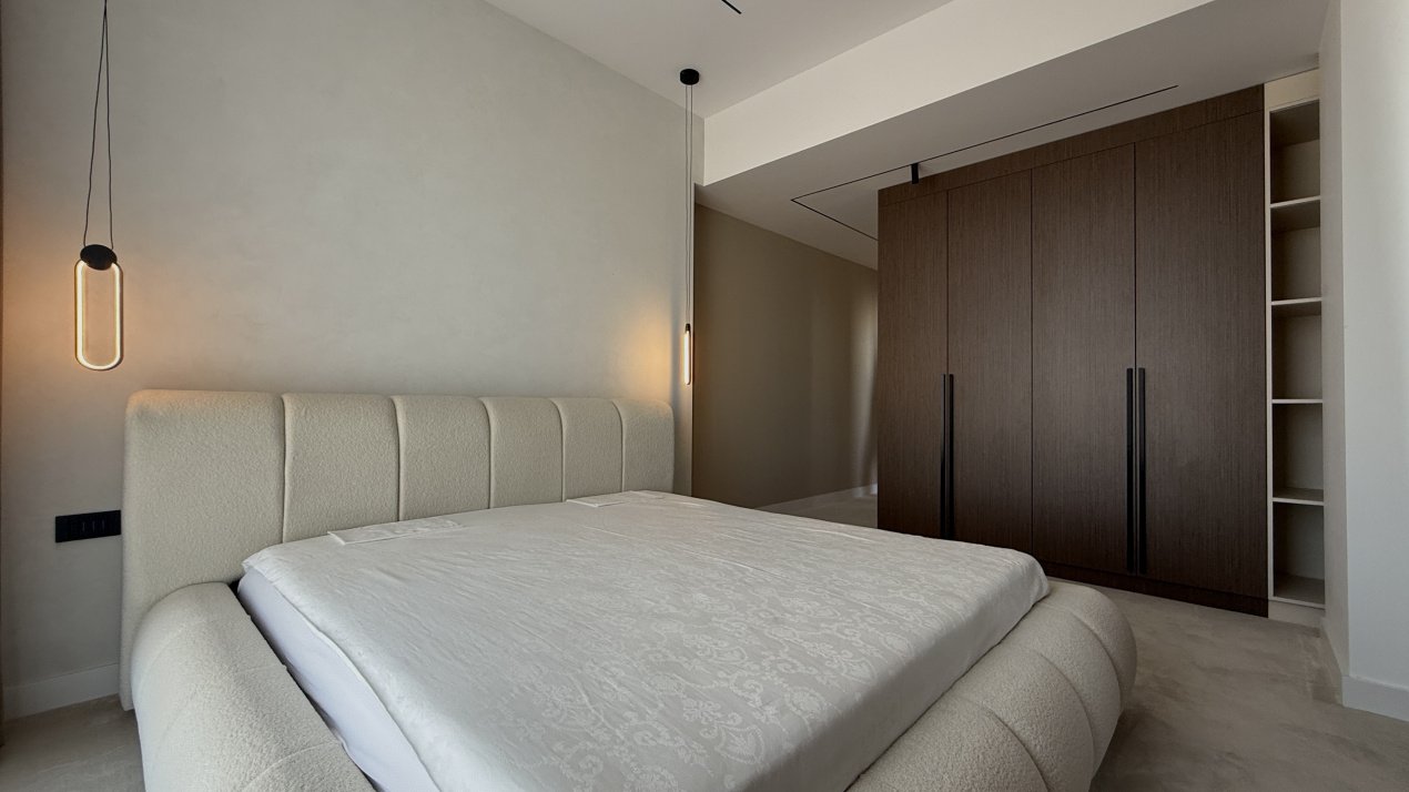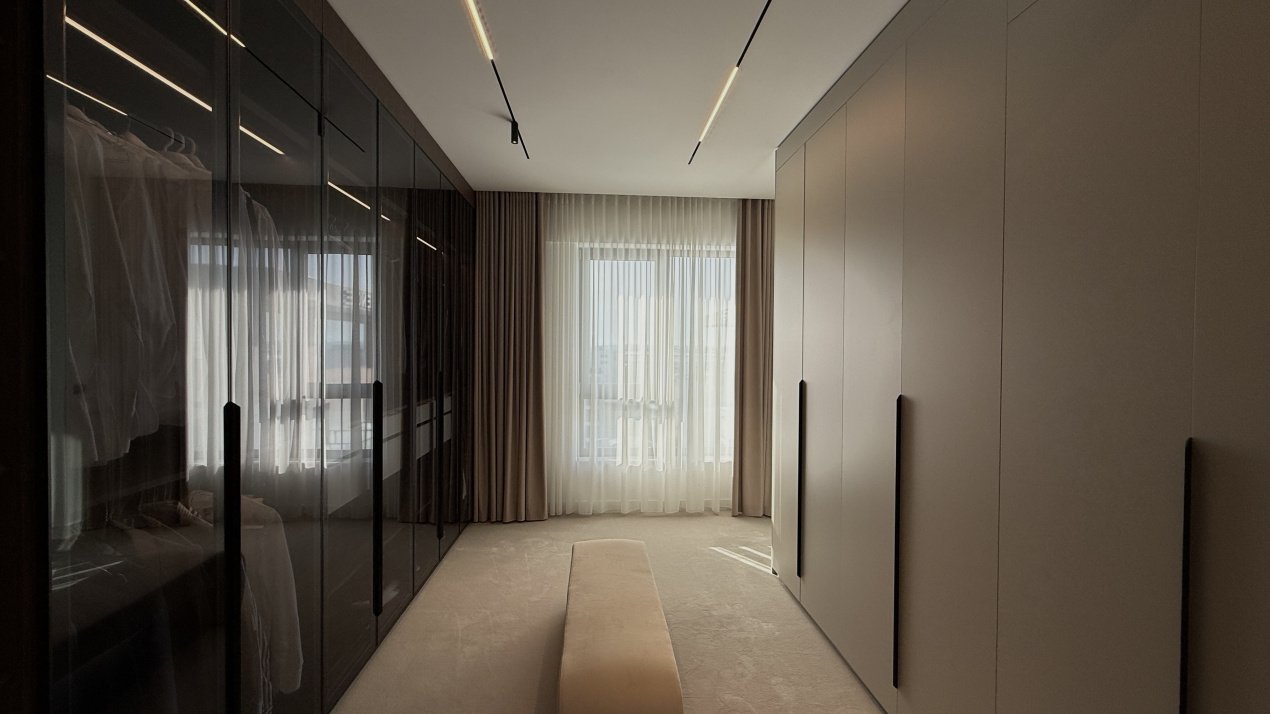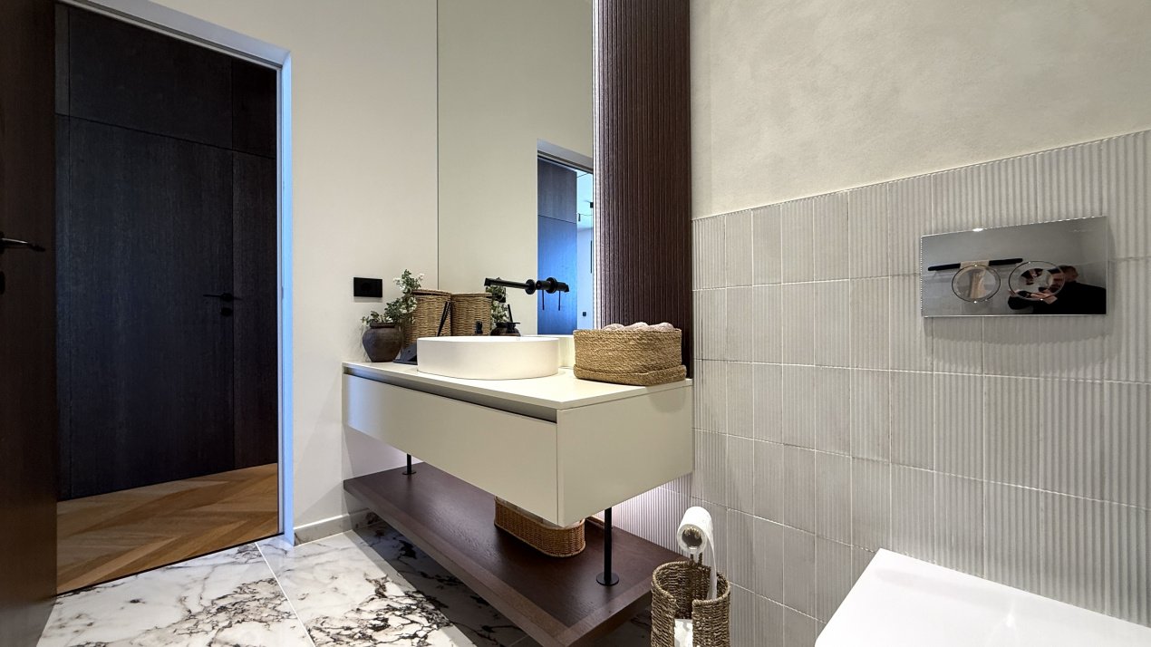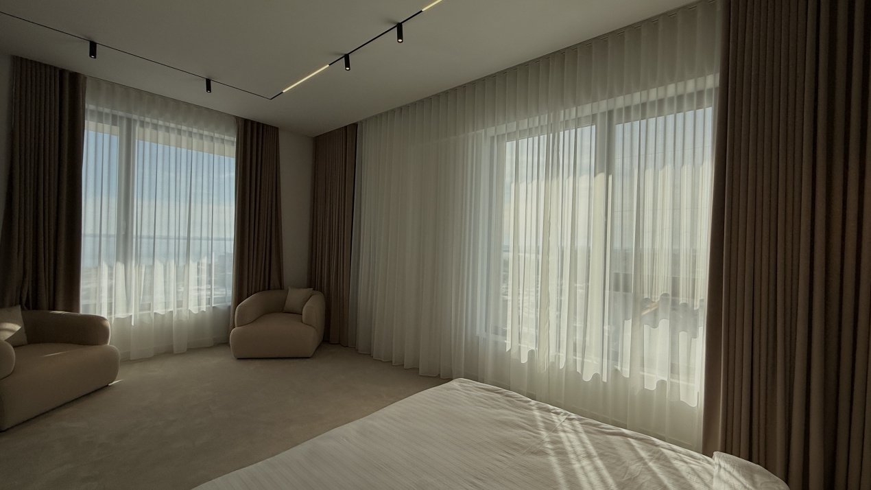 Lumina naturală inundă fiecare încăpere datorită suprafețelor vitrate generoase, iar compartimentarea deschisă creează un ambient aerisit și rafinat. Întregul apartament a fost amenajat cu atenție la fiecare detaliu, pe baza unui proiect de design interior realizat de o echipă profesionistă, unde mobilierul și elementele decorative se îmbină armonios pentru a crea o atmosferă elegantă și primitoare.