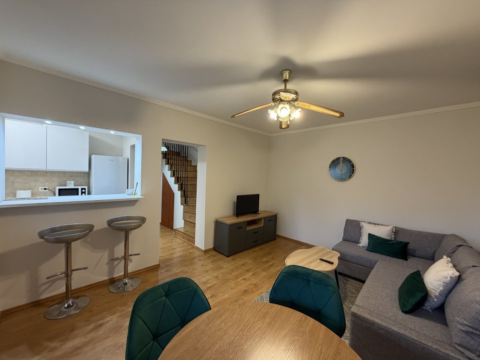 Parter: living generos cu bucătărie deschisă, baie și un dormitor spațios.