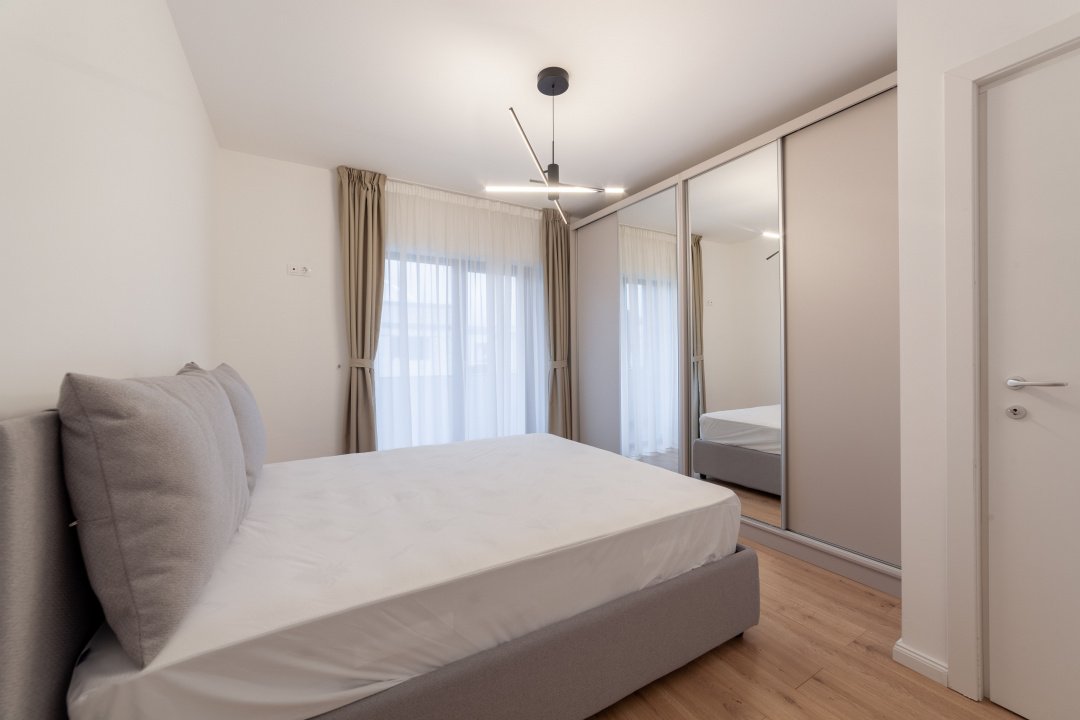 Etaj: 3 camere: doua dormitoare, dintre care unul matrimonial cu baie proprie, iar cea de-a treia camera poate fi amenajata in functie de necesitatile si preferintele chiriasului: dormitor suplimentar, dressing, birou sau sala de fitness. Exista o baie separata pentru celelalte camere.