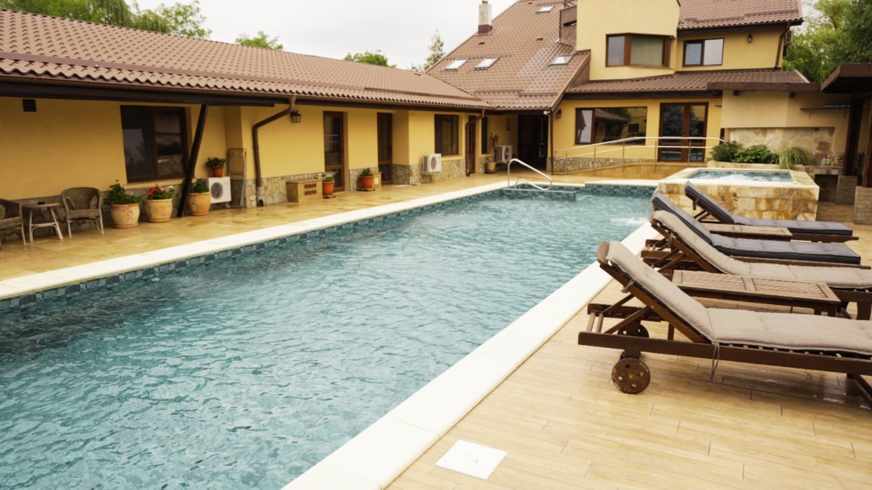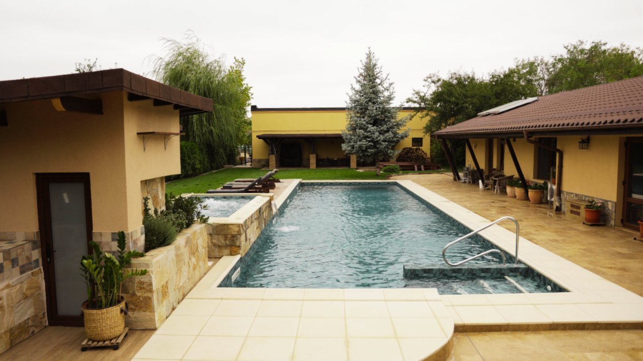 🏊 - Piscină impresionantă (85 mp) și jacuzzi (10 mp) – construită în 2023, cu filtrare automată, hidroliză și iluminat LED subacvatic