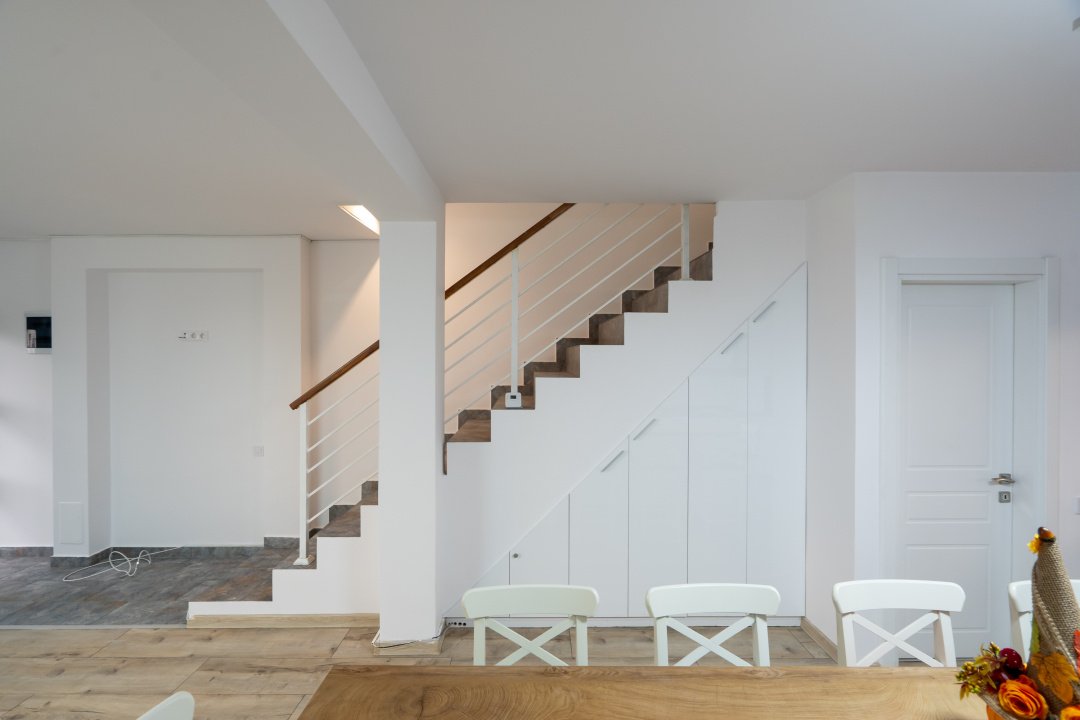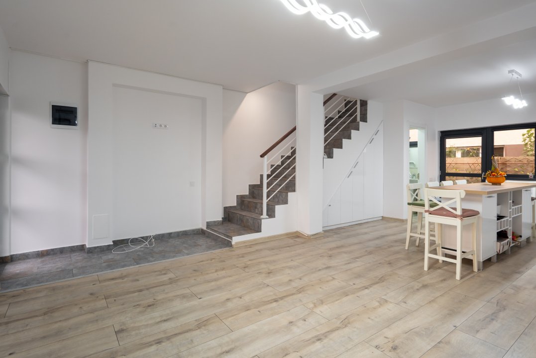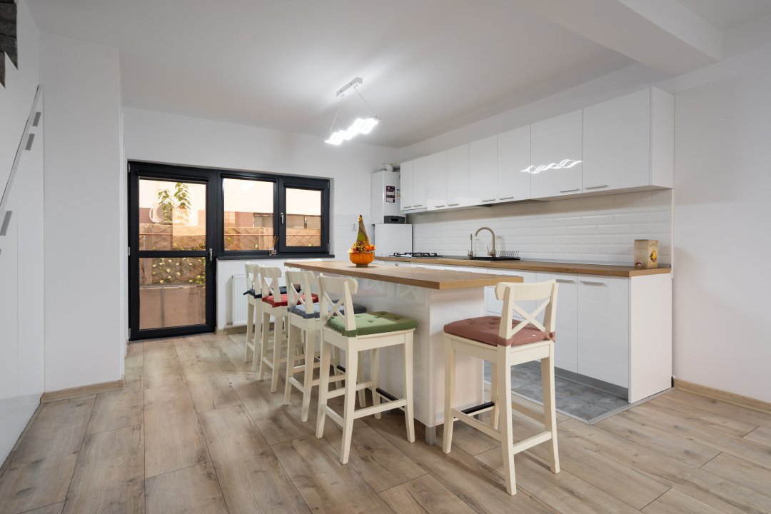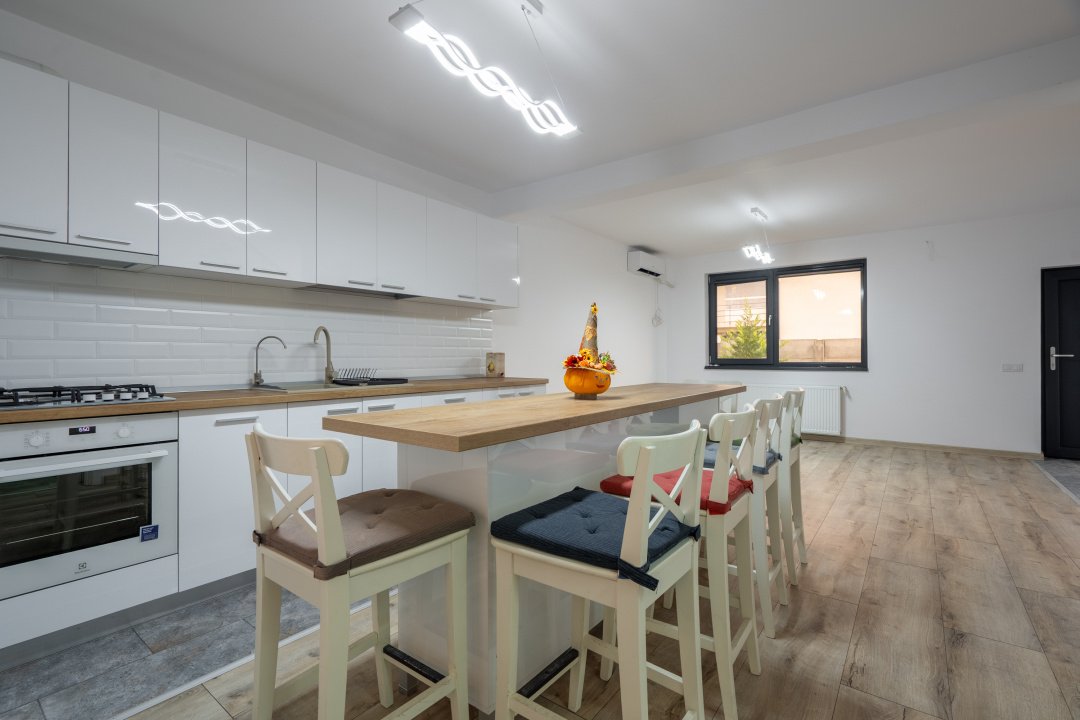 La parter, spațiul generos de living și bucătărie open-space devine centrul vieții de familie. Bucătăria modernă, cu mobilier minimalist și zonă de dining integrată, este creată nu doar pentru a găti, ci și pentru a aduna oamenii împreună – pentru cine, conversații și amintiri.