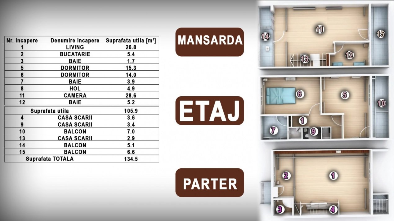 Etajele superioare adăpostesc 3 dormitoare spațioase, fiecare cu balcon propriu, unde diminețile încep cu lumină naturală și seriile se încheie în liniște și confort. Al treilea dormitor fiind considerata mansarda care are si grup sanitar propriu