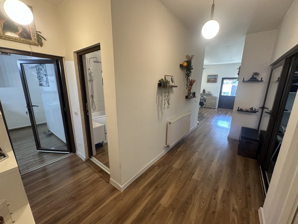 Casa este total mobilata si utilata, are 4 camere: Living spatios, trei dormitoare luminoase, 2 dressinguri, bucataria mare cu camara, are iesire catre terasa din spatele casei, camera tehnica cu centrala termica, baie mare cu cada si fereastra.