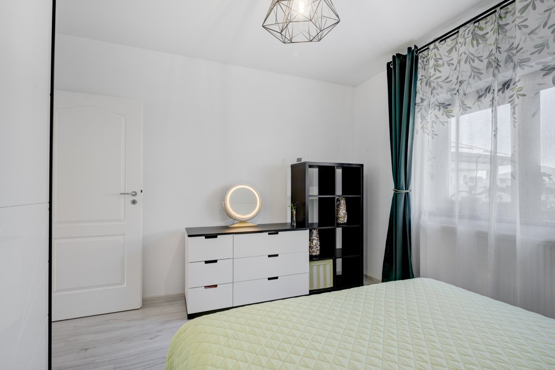 Casa dispune de trei dormitoare aerisite: două dormitoare de aproximativ 13 mp fiecare și un al treilea dormitor de circa 11 mp, potrivite atât pentru odihnă, cât și pentru birou sau cameră de copii. Cele două grupuri sanitare au suprafețe de 4,5 mp, respectiv 3,6 mp, iar holul generos, de peste 8,5 mp, contribuie la senzația de spațiu și fluiditate.
