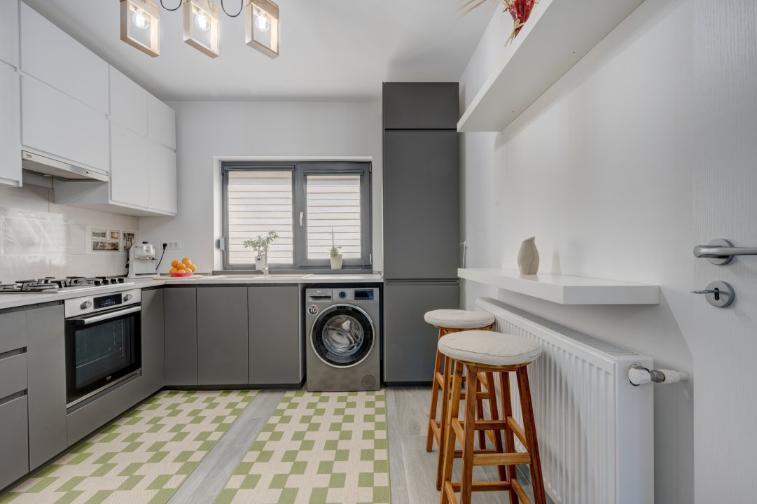 Bucătăria este unul dintre punctele forte ale casei — spațioasă, cu o suprafață de 10,7 mp, aceasta reprezintă un adevărat nucleu al locuinței, făcând legătura naturală cu restul spațiilor.