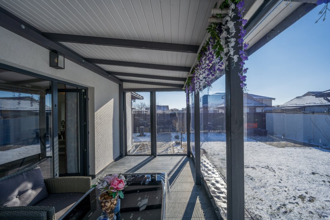 Terasa, cu o suprafață de 12,5 mp, a fost închisă ulterior și a devenit o extensie firească a zonei de zi, realizând o legătură armonioasă între interior și curte.