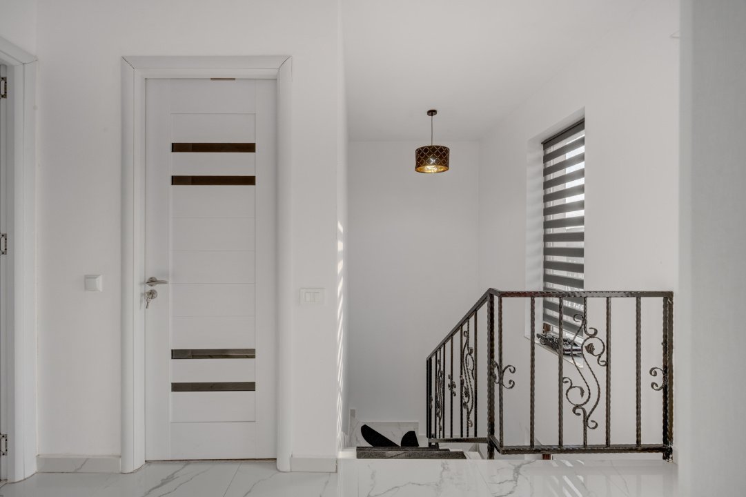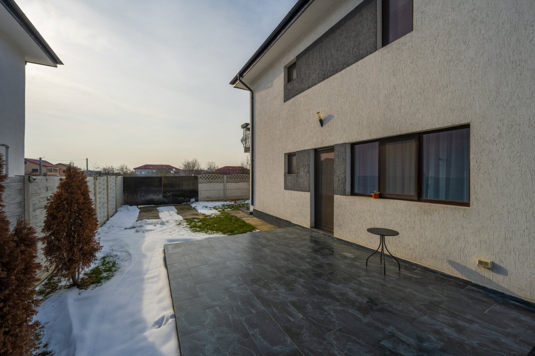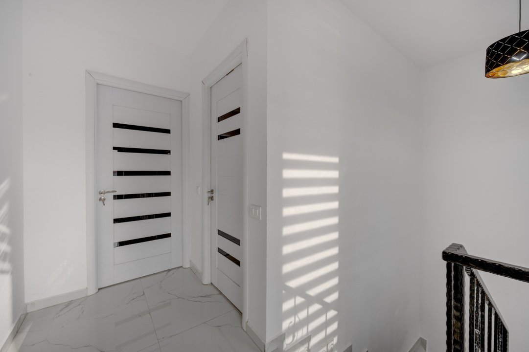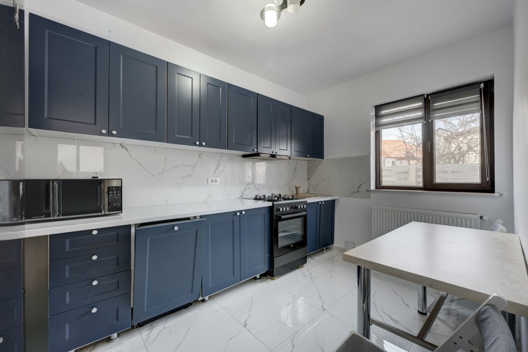 Bucataria este complet mobilata si utilata (aragaz, hota, masina de spalat vase, frigider). Dormitorul de la parter este amenajat cu un dulap generos si birou. Livingul este amenajat cu o canapea, comoda TV si spatii pentru depozitare. Fiecare dormitor are pat iar cel matrimonial are amenajat un dressing deschis.