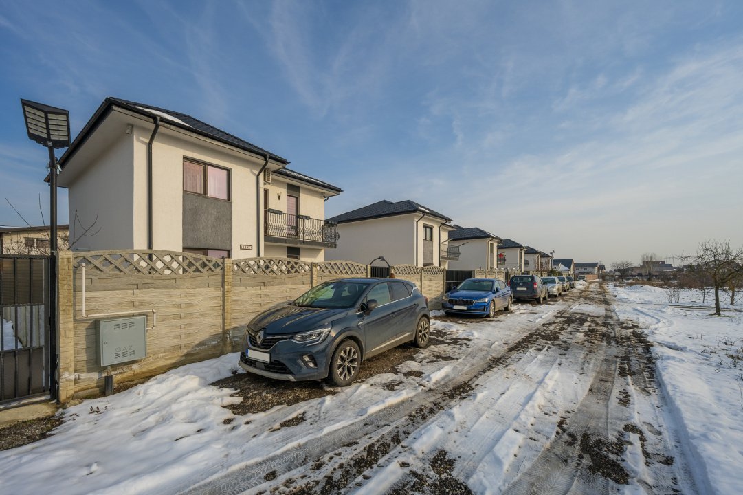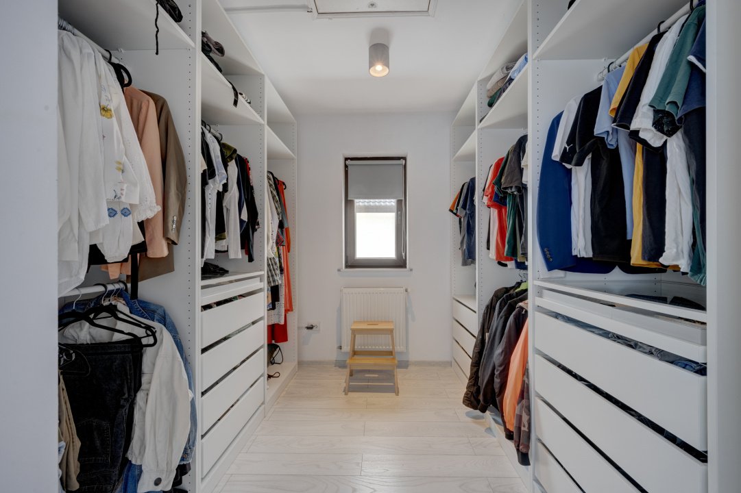 Bucataria este complet mobilata si utilata (aragaz, hota, masina de spalat vase, frigider). Dormitorul de la parter este amenajat cu un dulap generos si birou. Livingul este amenajat cu o canapea, comoda TV si spatii pentru depozitare. Fiecare dormitor are pat iar cel matrimonial are amenajat un dressing deschis.