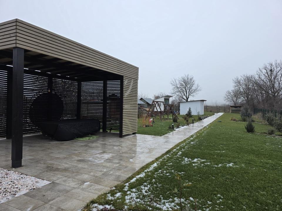 Curte complet amenajată cu gazon, pavaj, plante perene, flori și arbuști decorativi. Zona verde este completată de arbuști și pomi fructiferi: zmeură, aronia, coacăze, goji, cătină, mur, smochin.