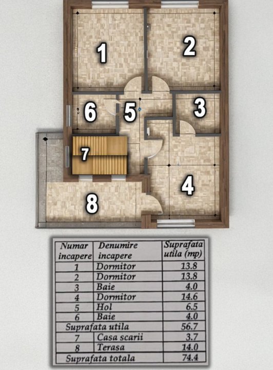 Vila are 4 camere, dintre care 3 dormitoare, unul fiind amenajat ca birou, dar ușor de transformat înapoi în dormitor, în funcție de nevoi. Bucătăria open-space creează un ambient modern și primitor, iar cele 3 băi[una dintre ele fiind transformata in dressing, cu posibilitatea de a reveni la o baie functionala] asigură confort pentru toți membrii familiei.
