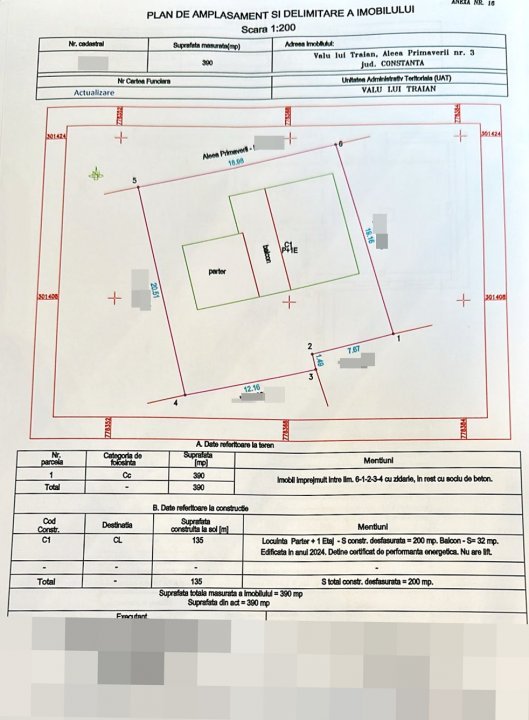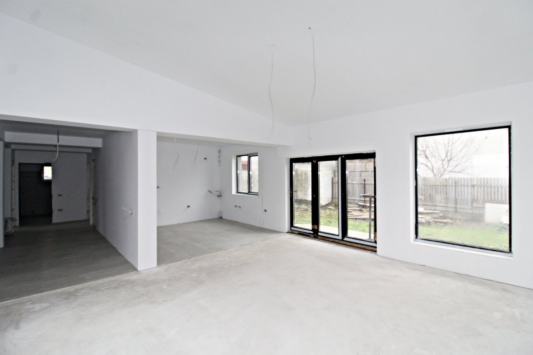 Vila moderna in zona Conacului, aflata pe o strada linistita si inchisa. Proprietatea este la stadiul de alb, construita in 2024 „ca la carte”, racordata la toate utilitatile si proiectata intr-un stil deosebit, cu linii moderne si spatii foarte bine gandite. Terenul are 390 mp cu deschidere de 18,98 ml, iar casa are 200 mp construiti desfasurati (108 mp utili la parter si 47,5 mp la etaj, plus o terasa superba de 32 mp). La parter regasim living cu bucatarie open space (cu posibilitatea de a fi separata), dressing la intrare, baie, doua dormitoare si camera tehnica pentru masina de spalat/depozitare. Etajul este dedicat zonei matrimoniale, cu dormitor, baie foarte mare, dressing si acces la terasa generoasa. Casa are incalzire in pardoseala, bai finisate cu gresie si faianta, gresie montata pe holuri si parchet cumparat (nemontat) pentru camere.