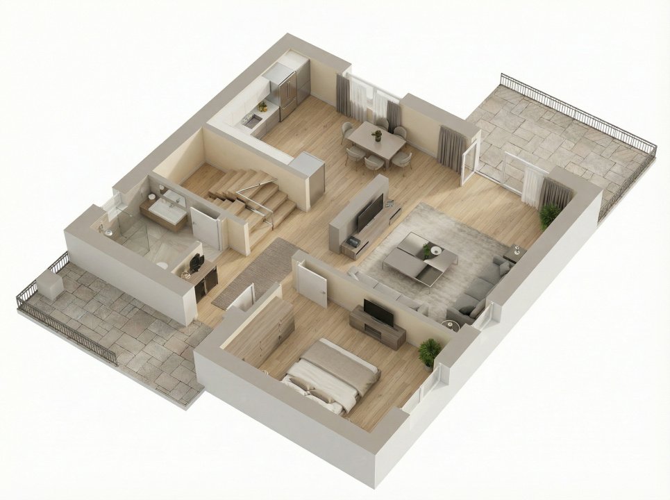 Parterul adună viața de zi cu zi: living luminos, bucătărie open-space și ieșire directă către terasă și curtea generoasă, cu peste 300 mp liberi. Un spațiu unde liniștea, joaca și serile în familie își găsesc locul.