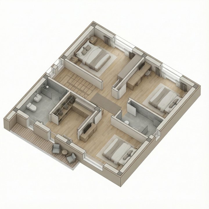 La etaj, patru dormitoare, trei băi cu geam și un balcon creează zona de intimitate. Scara interioară solidă leagă armonios cele două niveluri.