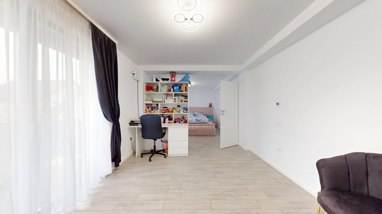 La etaj, zona de noapte este bine organizată și oferă intimitate. Cele trei dormitoare sunt luminoase și bine proporționate, iar unul dintre ele impresionează prin suprafața utilă de 27 mp, transformându-se într-un veritabil dormitor matrimonial. Baia de la etaj, dotată cu cadă și aerisire naturală, deserveste întreaga zonă.