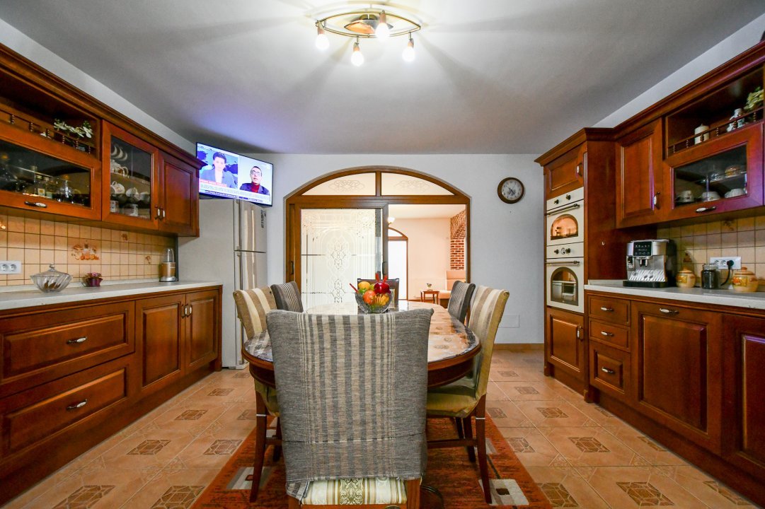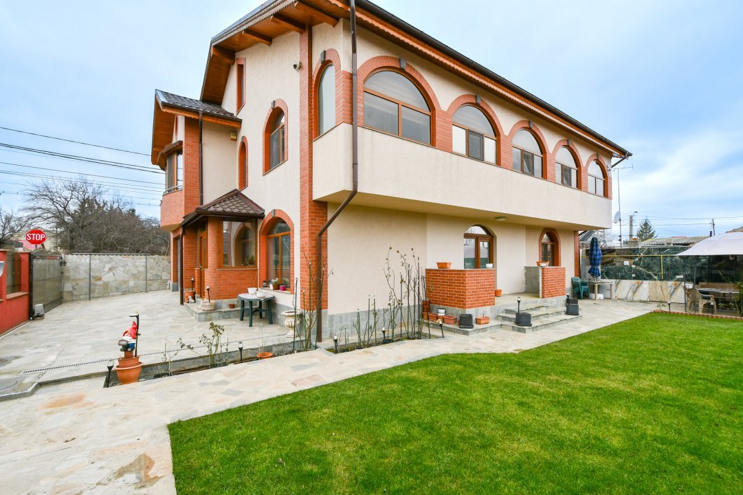 Constructia este realizata pe structura independenta de cadre din beton armat cu subsol realizat integral din beton armat cu cota de fundare 4,40m pe perna de piatra compactata, impermeabilizat si termoizolat cu strat bitum cauciucat, polistiren extrudat 5cm, strat caramida, membrana tefond si inca un rand de polistiren extrudat 5cm. Zidaria exterioara realizata din caramida Porotherm cu 8 celule (27cm) izolata exterior cu polistiren expandat 10cm finisat cu tencuiala decorativa structurata siliconata si placari caramida aparenta si zidarie interioara din caramida 20cm, ceeace asigura izolare fonica si termica superioara. Acoperisul este realizat in sistem asterial cu lemn ignifugat, bazie din lemn de fag lacuit cu jgheaburi de scurgere si burlane ingropate, invelit cu tigla metalica vopsita antistatic pe ambele parti si termoizolat in 2 straturi - polistiren extrudat (10cm) si vata minerala cu folie aluminiu anticondens (5cm), finisat interior cu rigips verde antiumezeala. Proprietatea dispune de un put forat (37m adancime din care 12m de apa) dotat cu hidrofor, care alimenteaza sistemul de irigatie automatizat cu 13 aspersoare si instalatie picurator cu panou de comanda/automatizare si sistem bypass pentru alimentare casa in caz de necesitate/urgenta. Curtea este amenajata cu alei placate cu piatra naturala import Italia montata pe pat de beton armat cu plasa sudata de Buzau (conferind rezistenta ridicata in timp si stabilitate), zone gazon, flori, pomi si plante ornament, grup sanitar de curte construit din zidarie BCA placat integral cu piatra naturala cu acoperis tigla metalica si sistem solar pentru apa calda menajera, zona foisor cu toate instalatiile necesare trase, robinet de curte, sifoane colectoare si rigole scurgere ape pluviale, gard perimetral din zidarie BCA cu structura din beton armat finisat cu tencuiala decorativa siliconata + interior placat cu piatra naturala si poarta acces auto actionata din telecomanda.